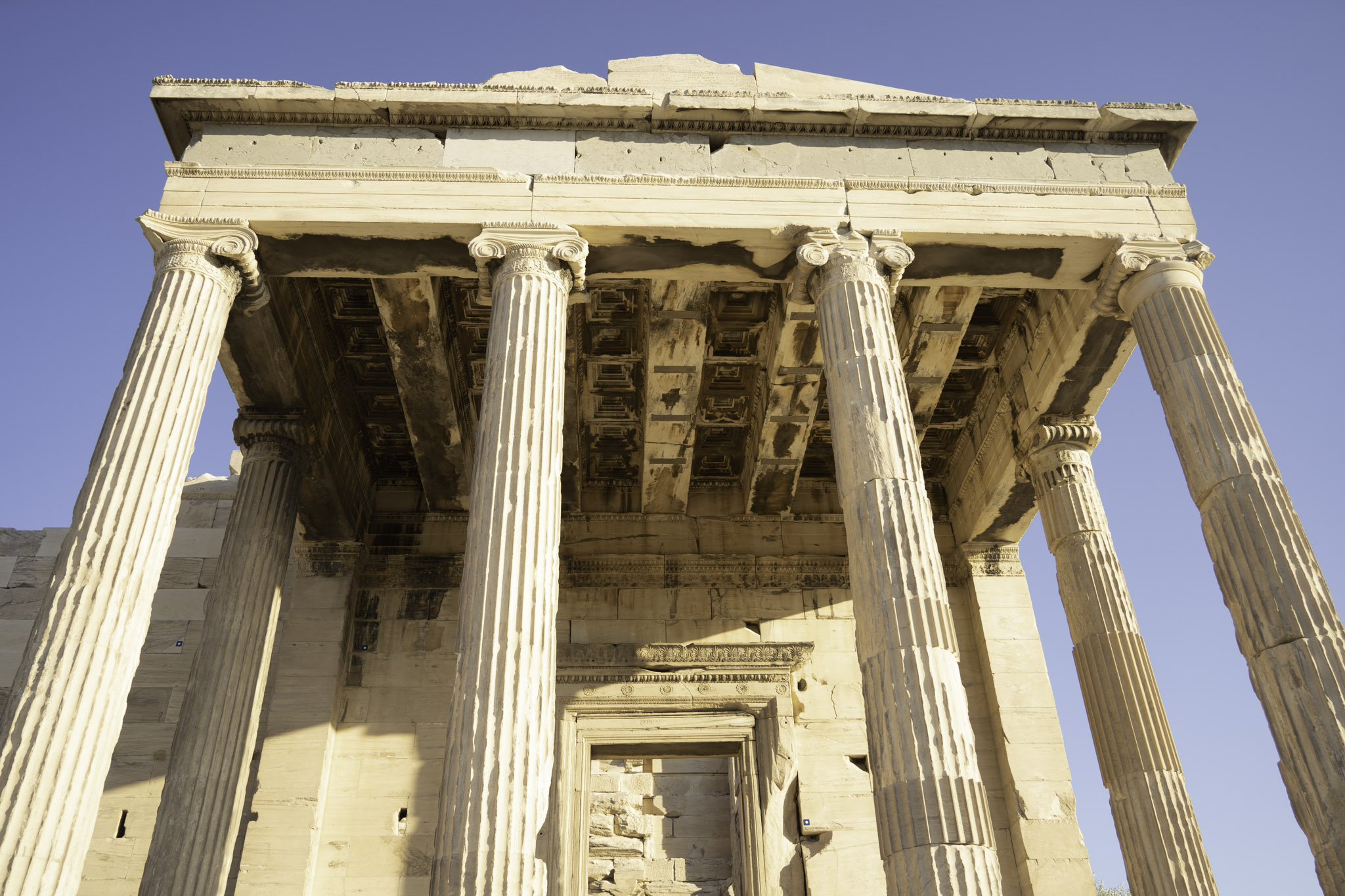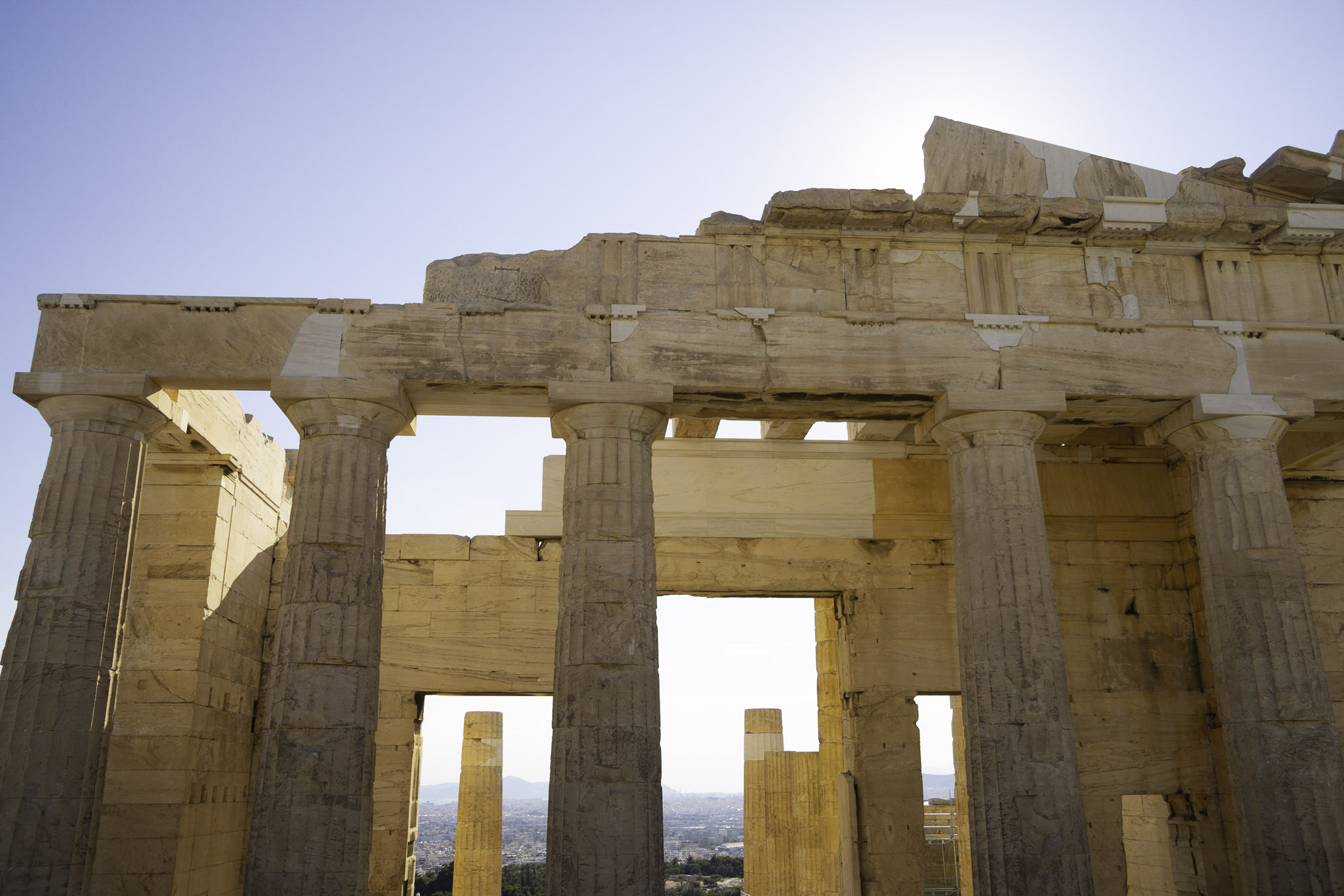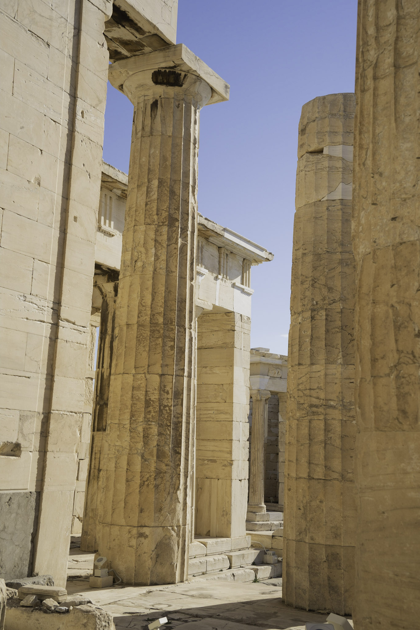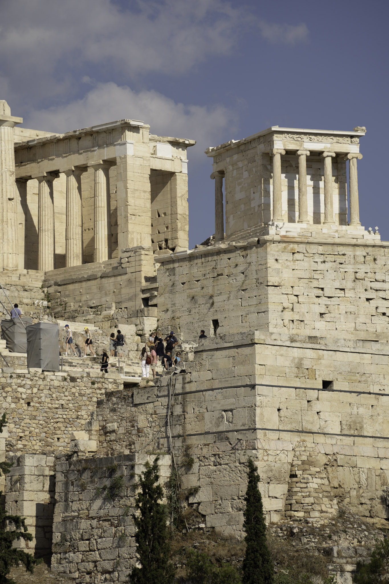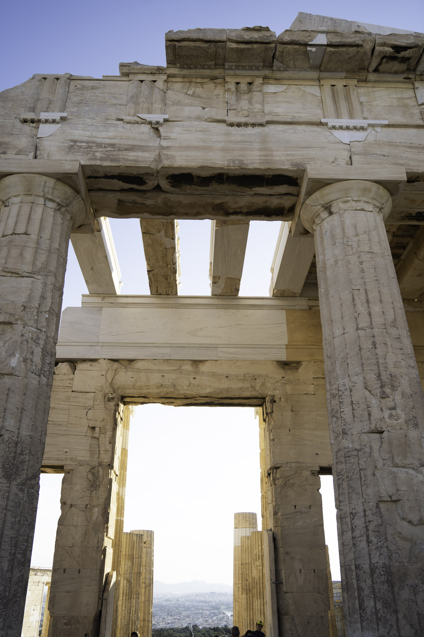 Somewhat refreshed, we hiked the short distance to the entrance and climbed the steps up to see the propylaea (main gateway) to the site. Something I learned on this trip that you may or may not know, is that the Acropolis is the hill on which stands the structures, including the main thing, the Parthenon. I always thought the Acropolis was its own ancient monument, but it is the hill itself. The Parthenon is a temple which was built to honour the goddess Athena and it is almost 2,500 years old. The building itself can only be viewed from the outside, as are the other structures on the site. The other two temples are called the Erechtheion (to worship Athena as the guardian of the city Athens) and the Temple of Athena Nike (to worship Athena as warrior defending Athens). The Parthenon, (Athena Parthenos) is to celebrate Athena as the patroness of the city.