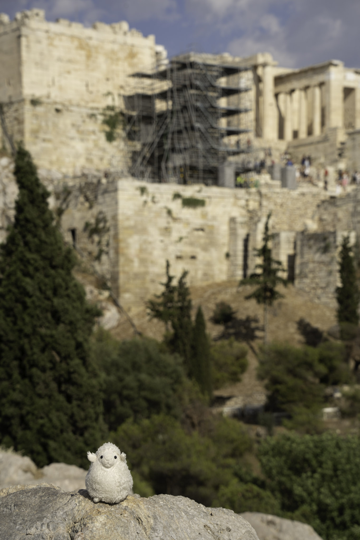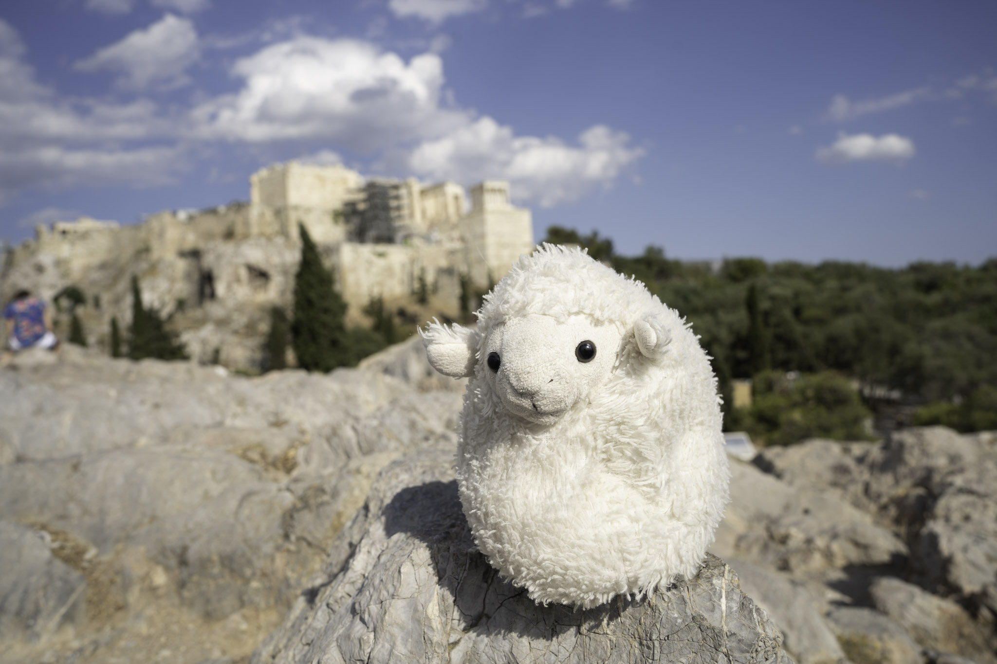 Anyway, we climbed to this rock and got a great view of the city and it was actually pretty neat to see the Acropolis from a different angle, and to say “hey, look at that throng of people traversing the slippery stones and enduring the heat!” while we were standing under an olive tree with only one other couple nearby. It was in these places that we got our necessary photos of Georgina the World Wide Travelling Sheep.