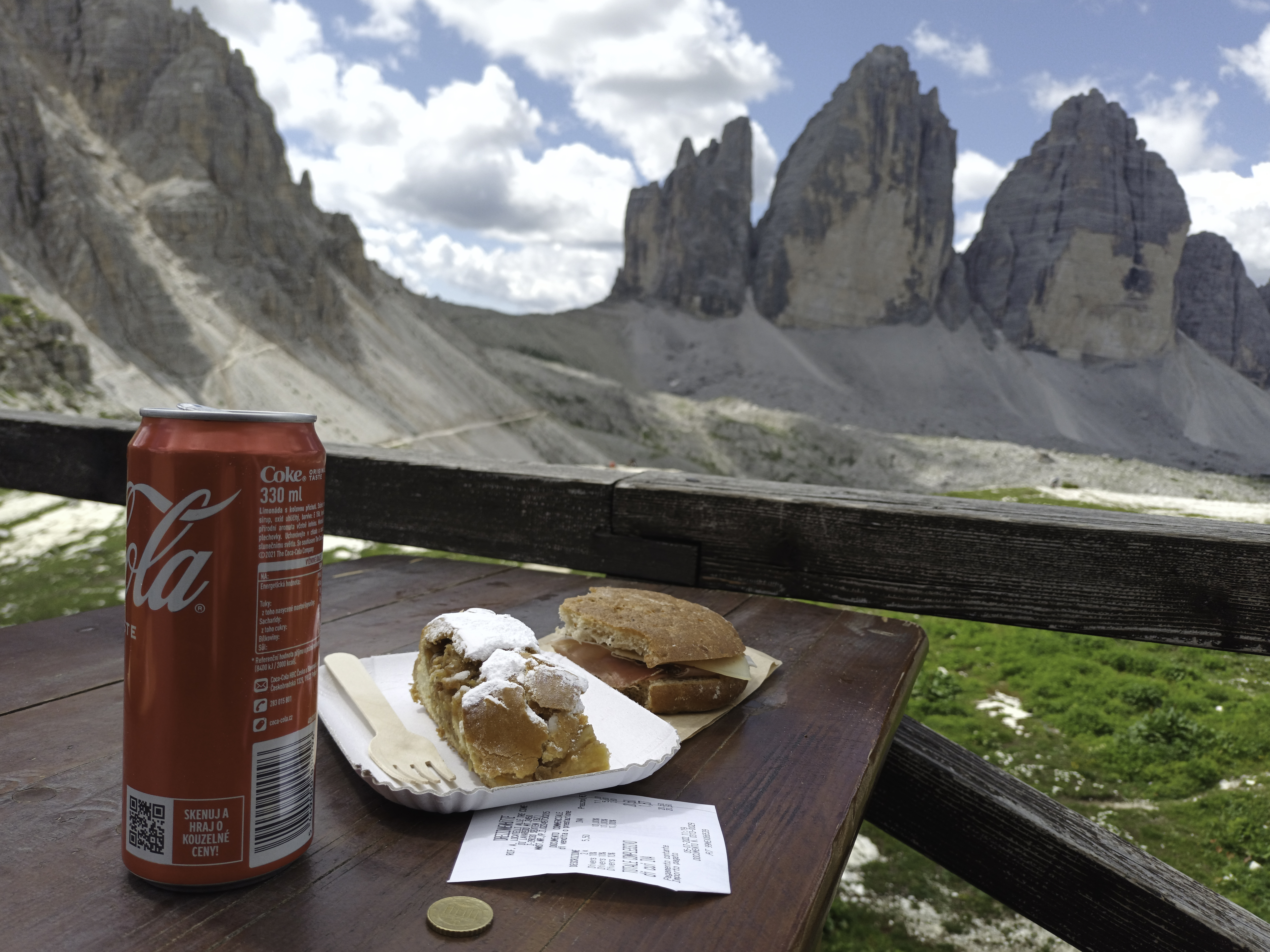 Our next destination was a great place to stop for lunch and gave us the best views of the three peaks. This was Rifugio Lavaredo, a very picturesque building which we took many photos of. We settled in and looked at the openness of the fields before us on one side, and the majestic three towers on the other side. We went in and bought a couple of paninis, a coke, and a strudel to share.