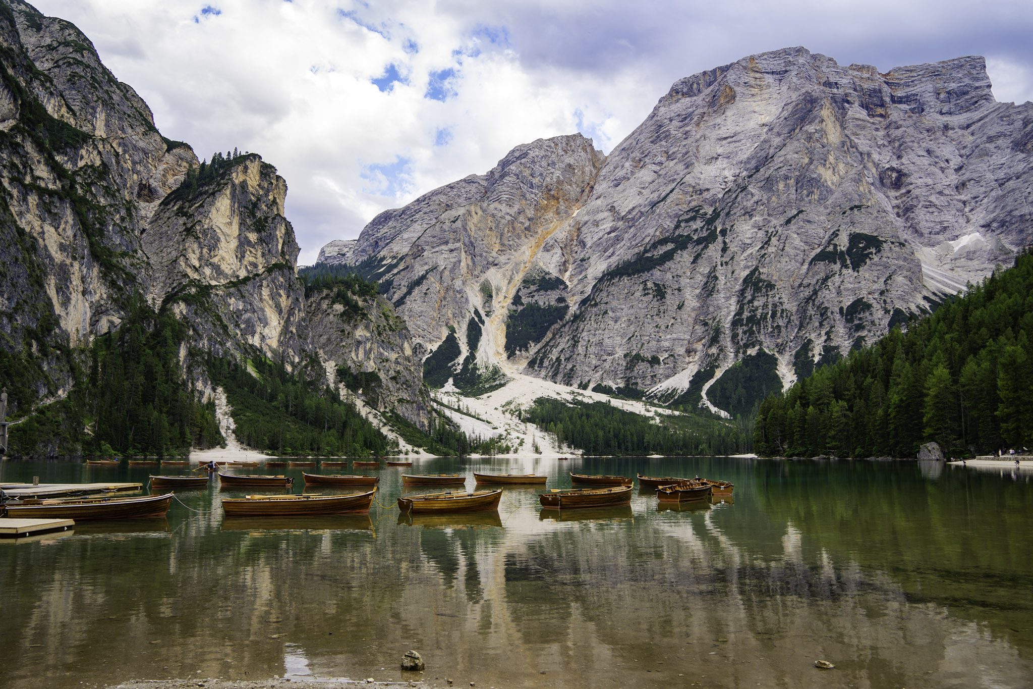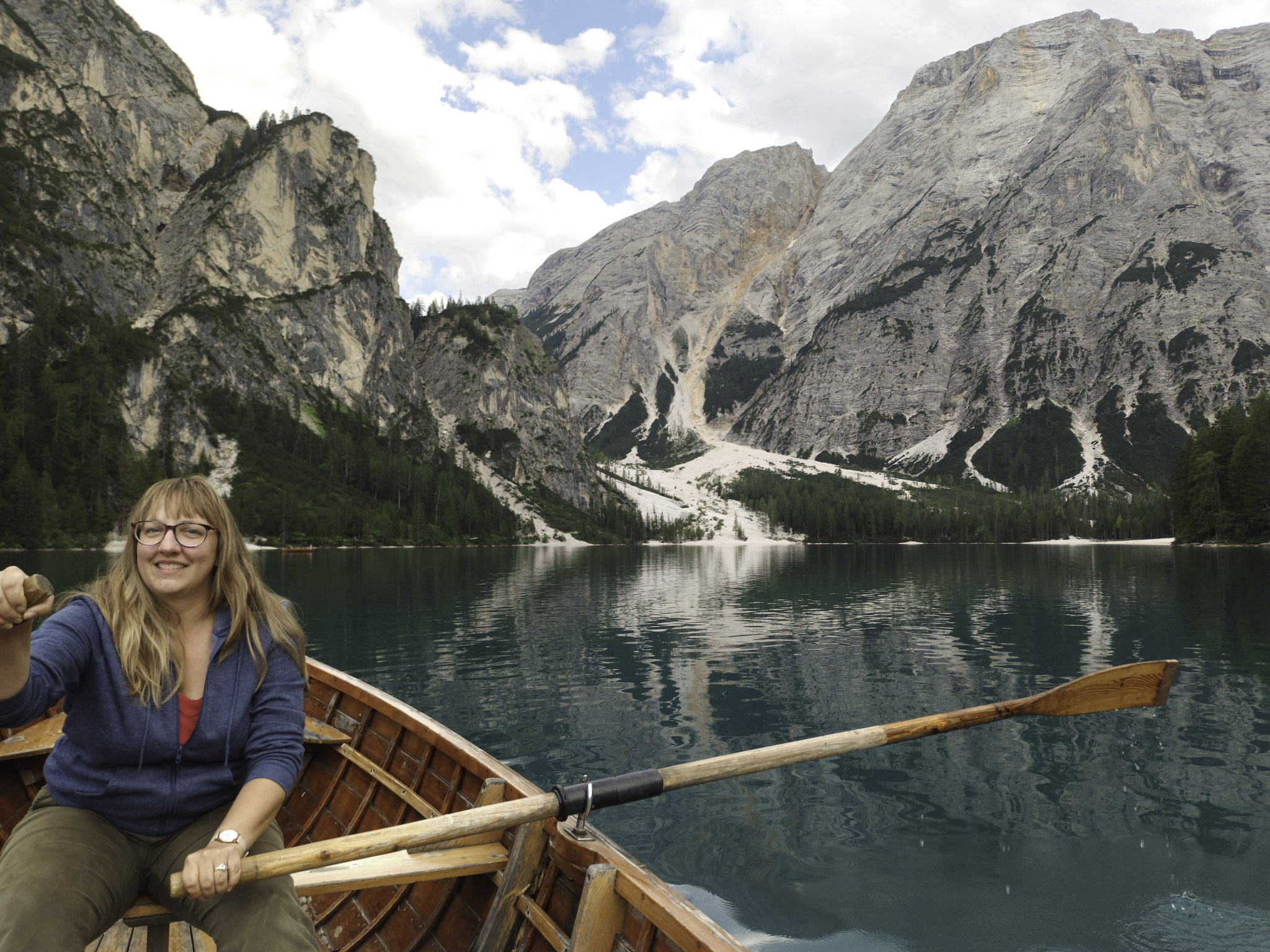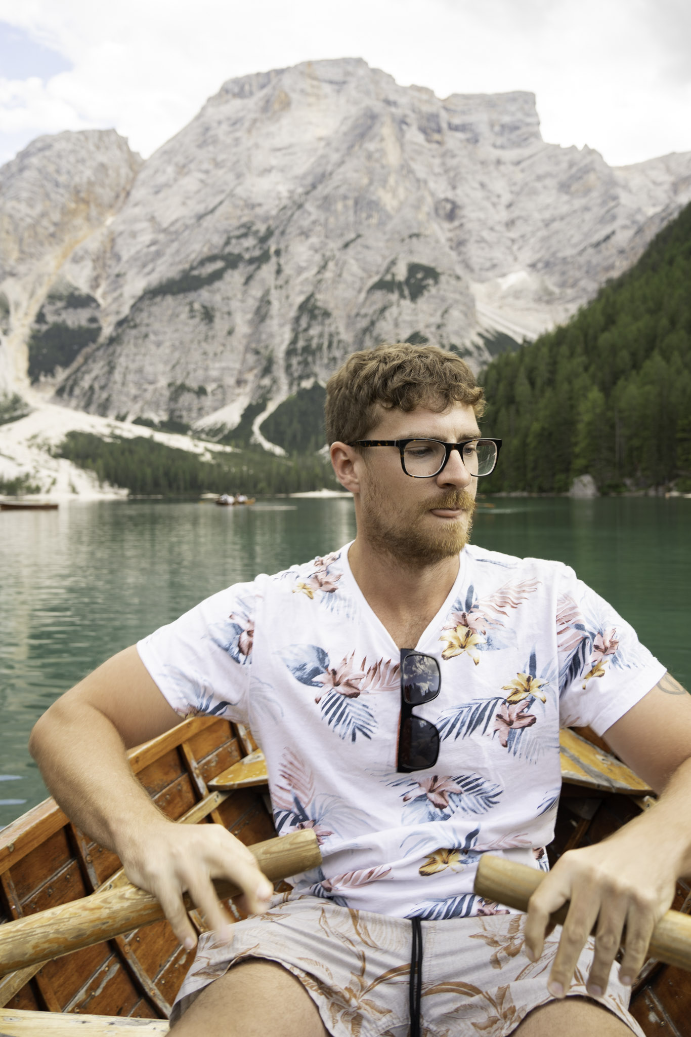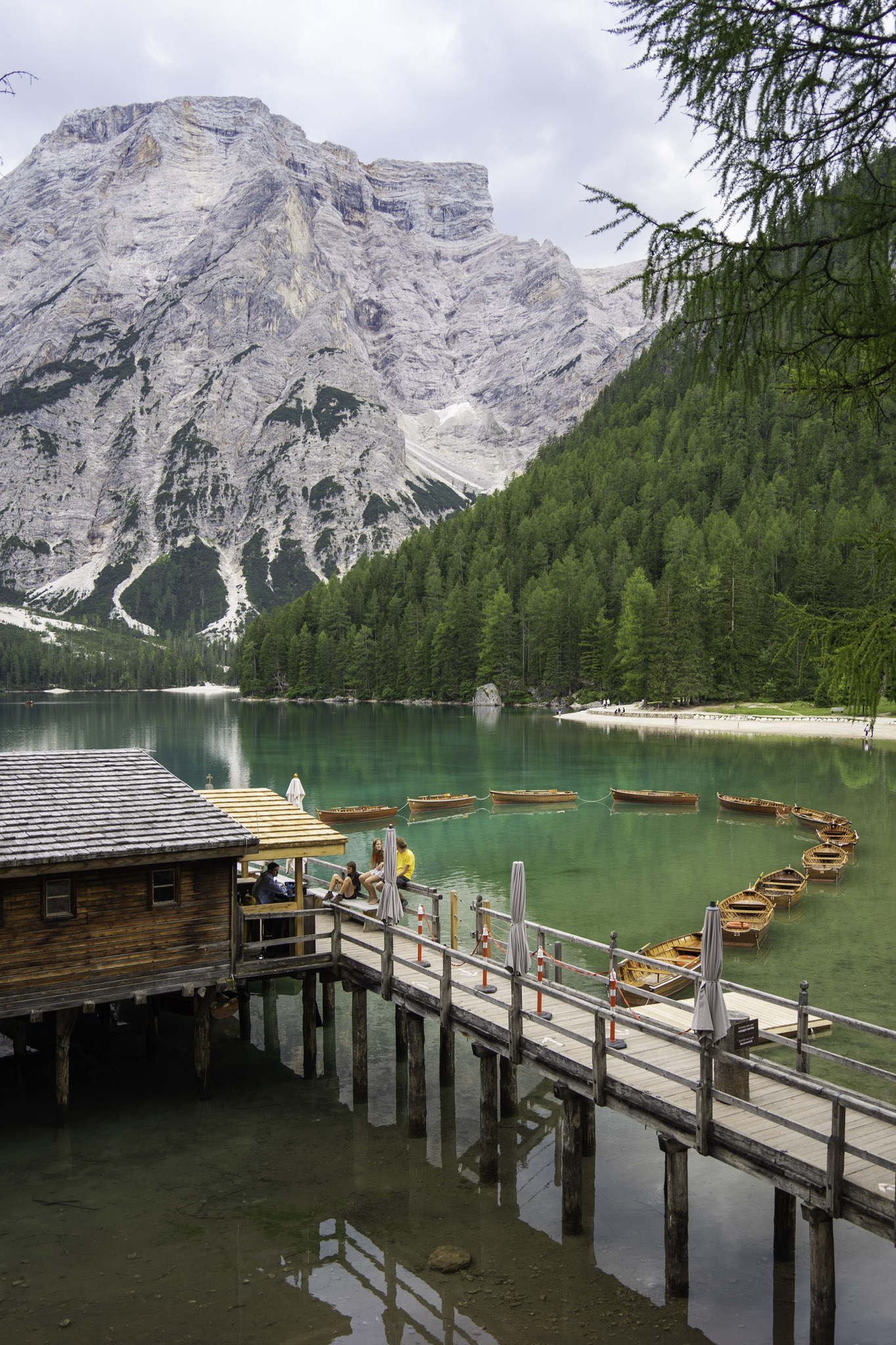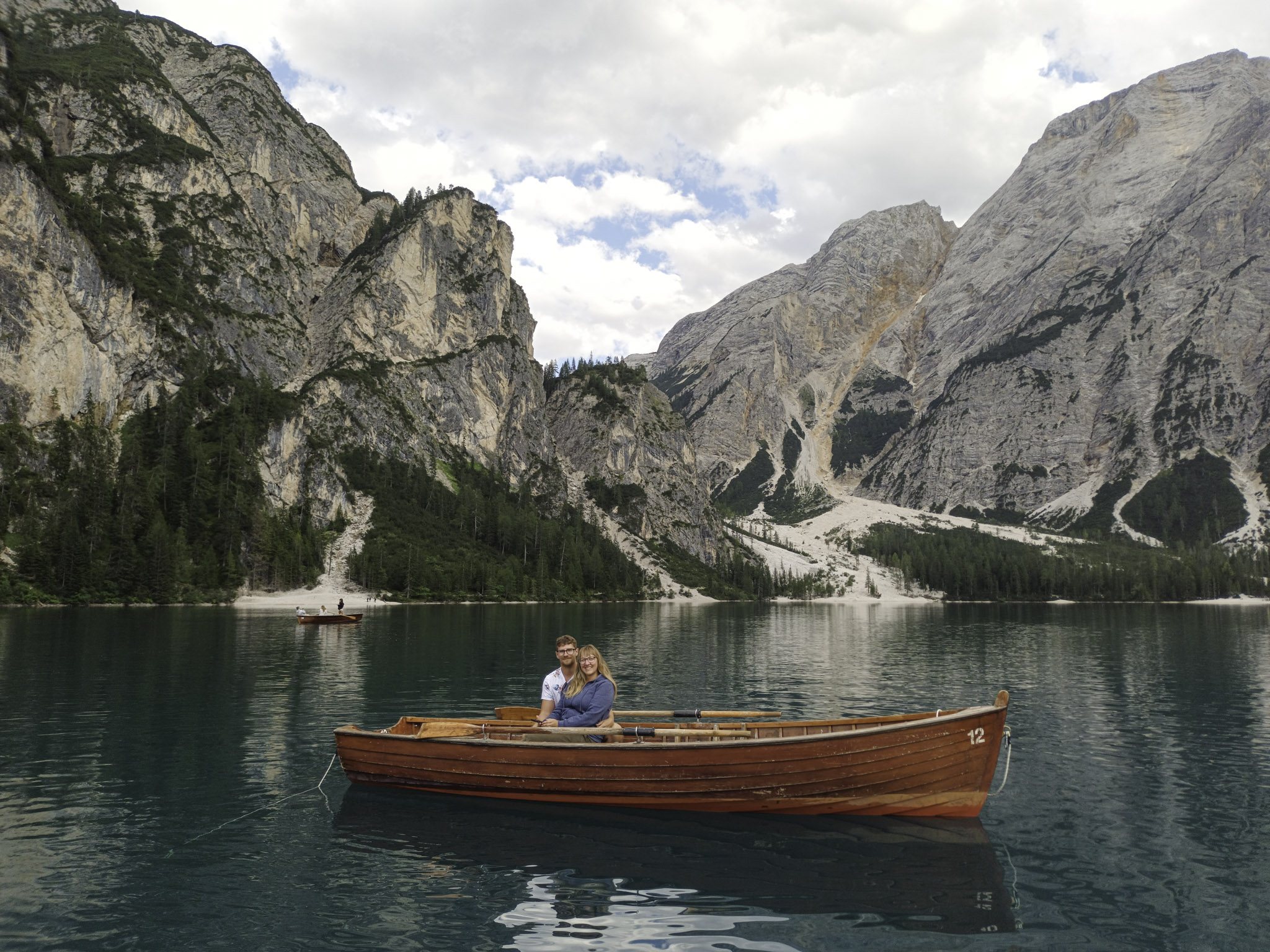 In the later afternoon we drove to another very popular lake: Lago di Braies. Also known as ‘Lago di Instagram’. This moniker is due to the fact this is a very accessible site with plenty of parking and only a five-minute flat walk to the actual site. This lake was a complete surprise to me, as I am terrible at travel planning and had no idea it existed. Callum told me we should make the drive there in the late afternoon and I felt sooo tired. I asked ‘If we don’t go, will we regret it?’ The answer was ‘yes’ so we jumped in the car and went. I was clueless as to the popularity and iconic shot of the boats on the water. The first thing that I thought was ‘Oh, it looks like Lake Louise, in Canada!’ and the first thing I said was ‘Oh, you can rent boats! Let’s do it!’