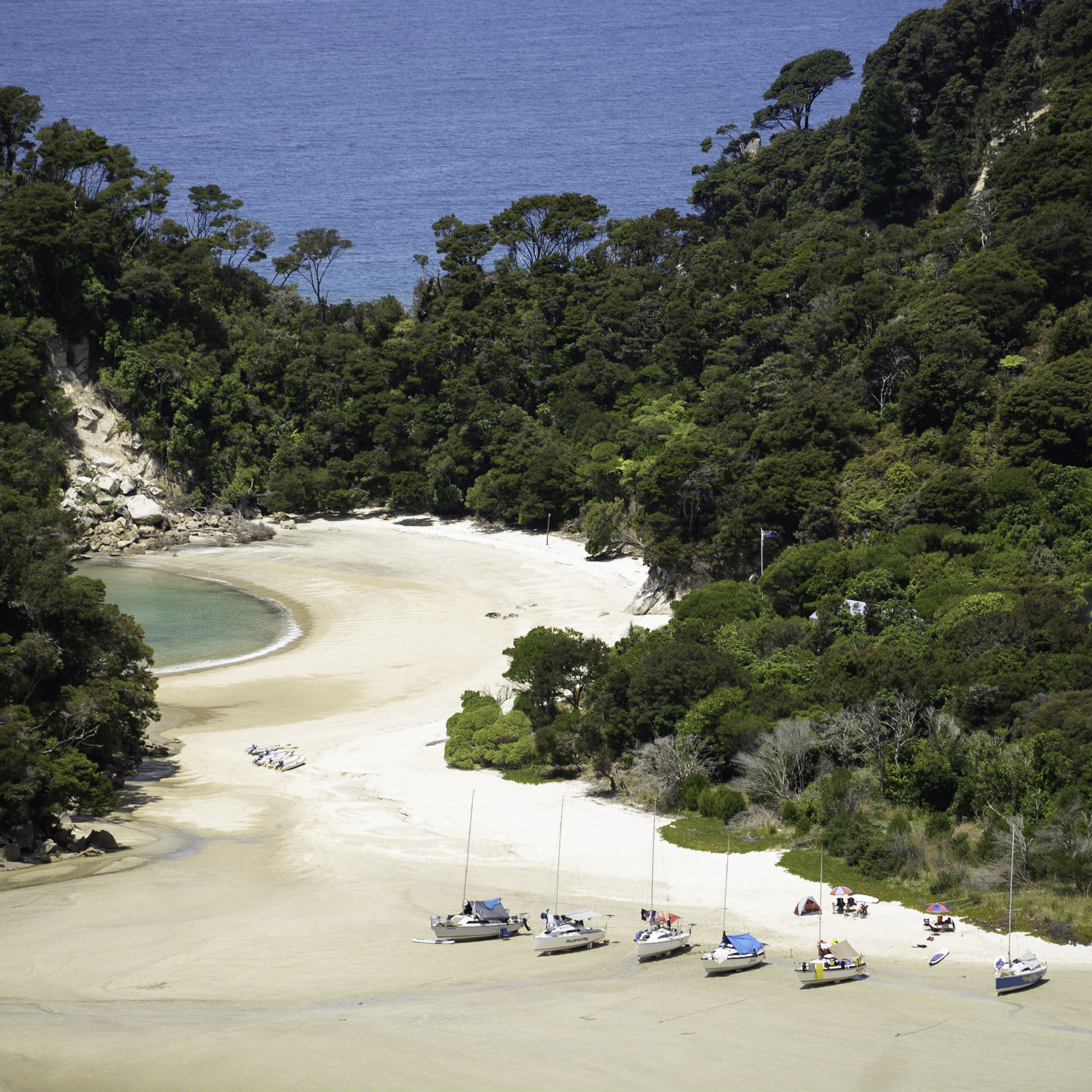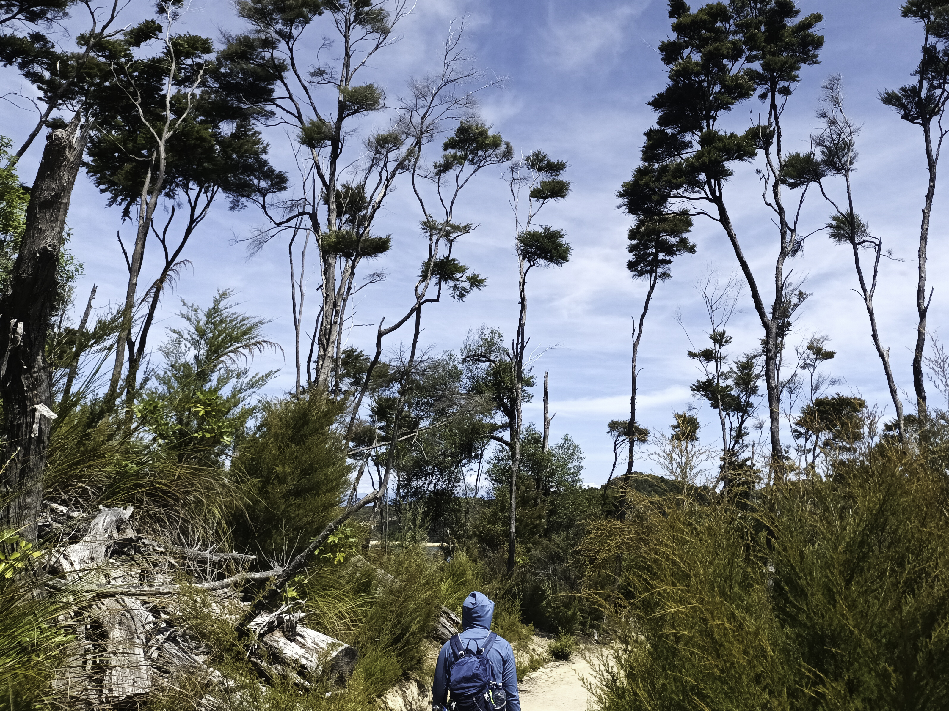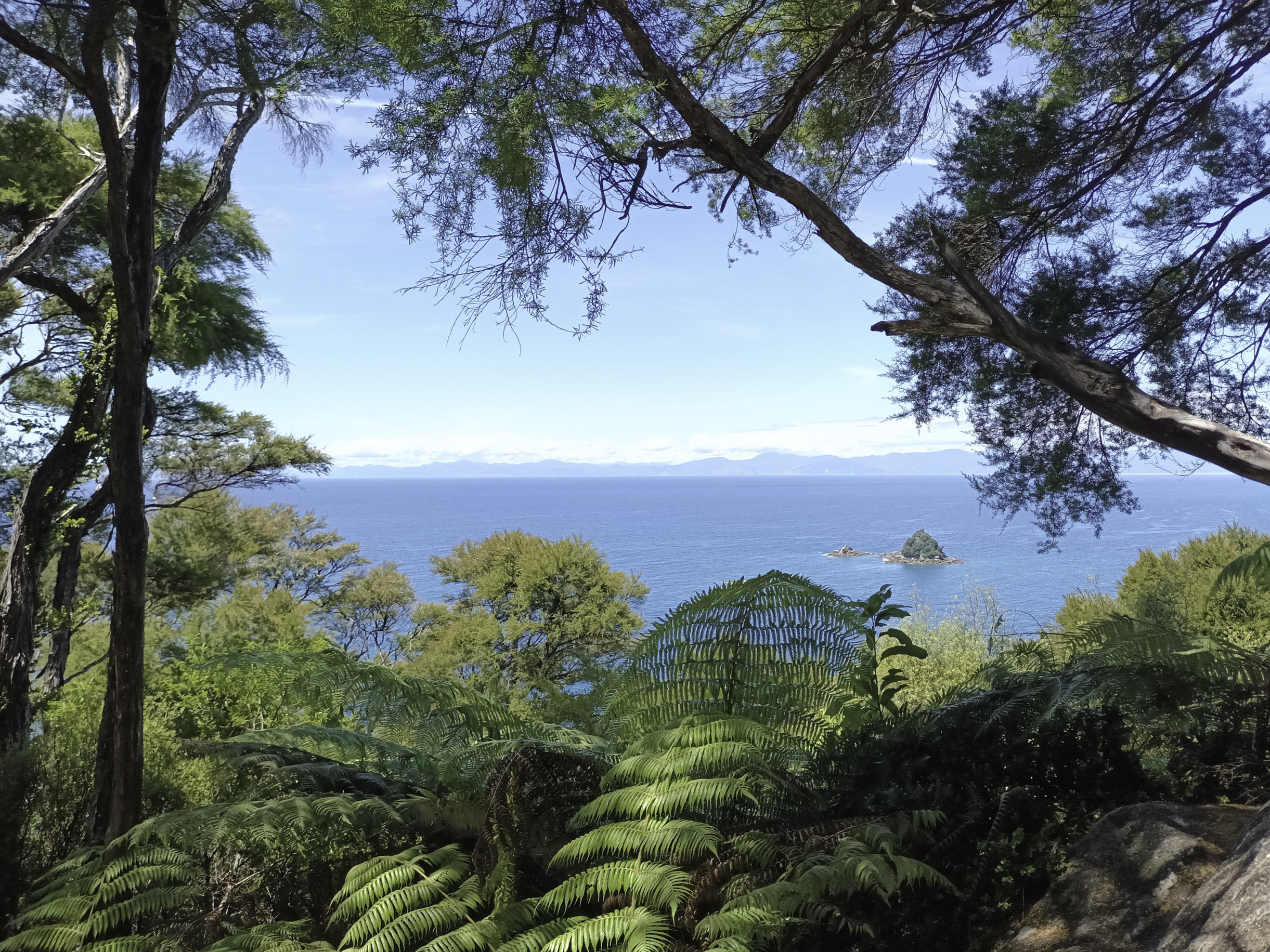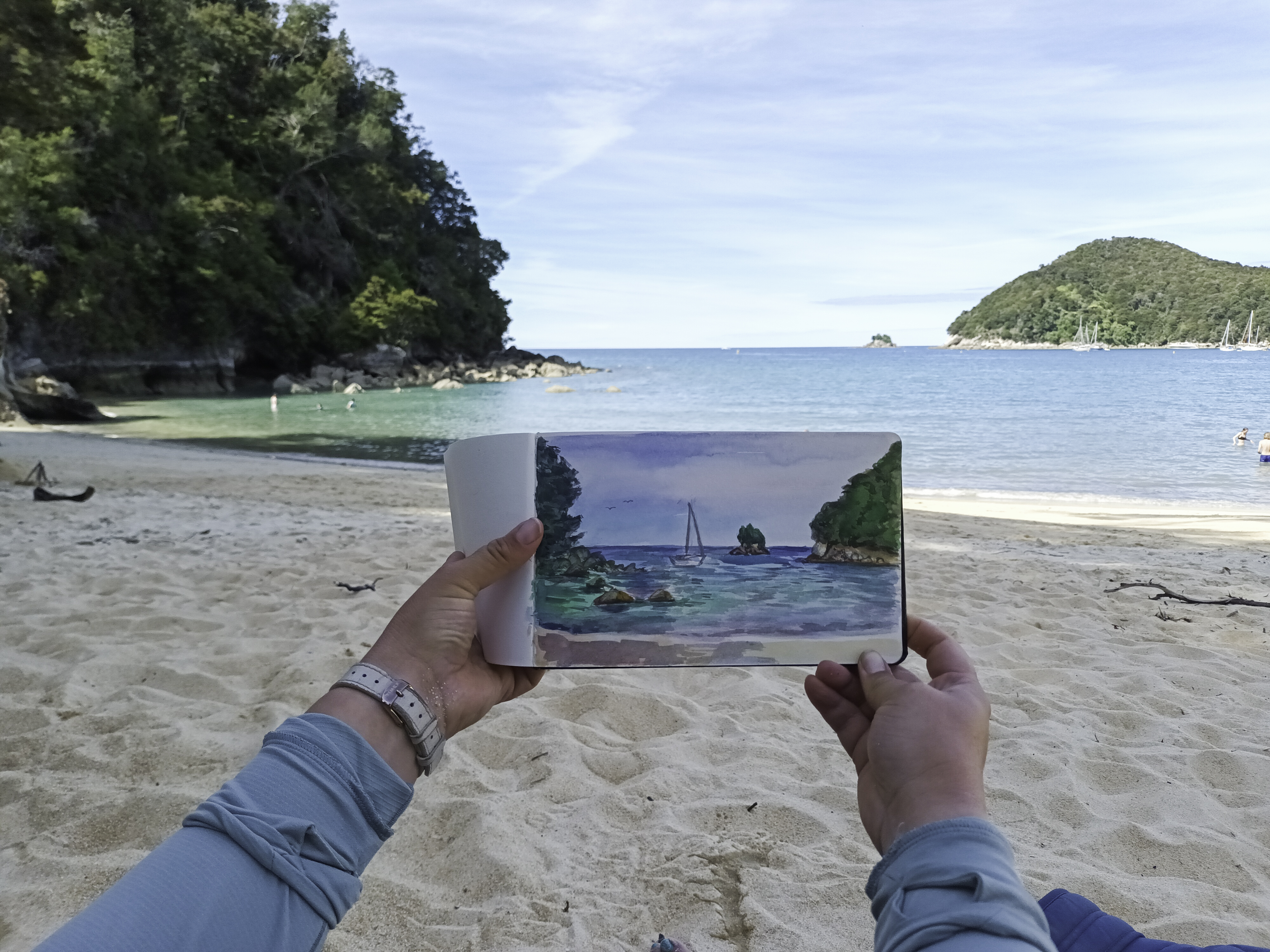 We boarded our boat and were tickled pink by the rough seas and roller-coaster bumps and dips. We’re both fortunate not to be sea-sick, so I’m not being facetious when I say we enjoyed ourselves. Not so for other sea-faring guests, however, as they were offered to be let off the vessel before their planned departure since the ride was so rough. We didn’t mind. We rode up the coast as far as Totaranui, then were taken back down the same route and got off at Medlands Beach, which took about 2 hours. From Medlands, we walked backwards to see Bark Bay, then forwards again to Anchorage Bay, about 7kms and in total 9 kms. It was very fortunate that our day dried out and brightened up so that we could fully enjoy the walk along this beautiful coastline. Once back at Anchorage Bay, we had time for a rest and a dip in the water, I did a little painting, and then we were picked up by the last boat of the day to take us back to Kaiteriteri. It was a splendid day enjoying nature and one of my favourite activities we did. The walk was at times hot and sweaty, but I enjoyed the exercise because we were mostly in the shade, and we had plenty of viewpoints where we got to appreciate the view. I highly recommend spending a full day in this area of New Zealand. Some people do multi-day hikes and camp at the available campgrounds along the way. This is something we would definitely do if we lived in Nelson.