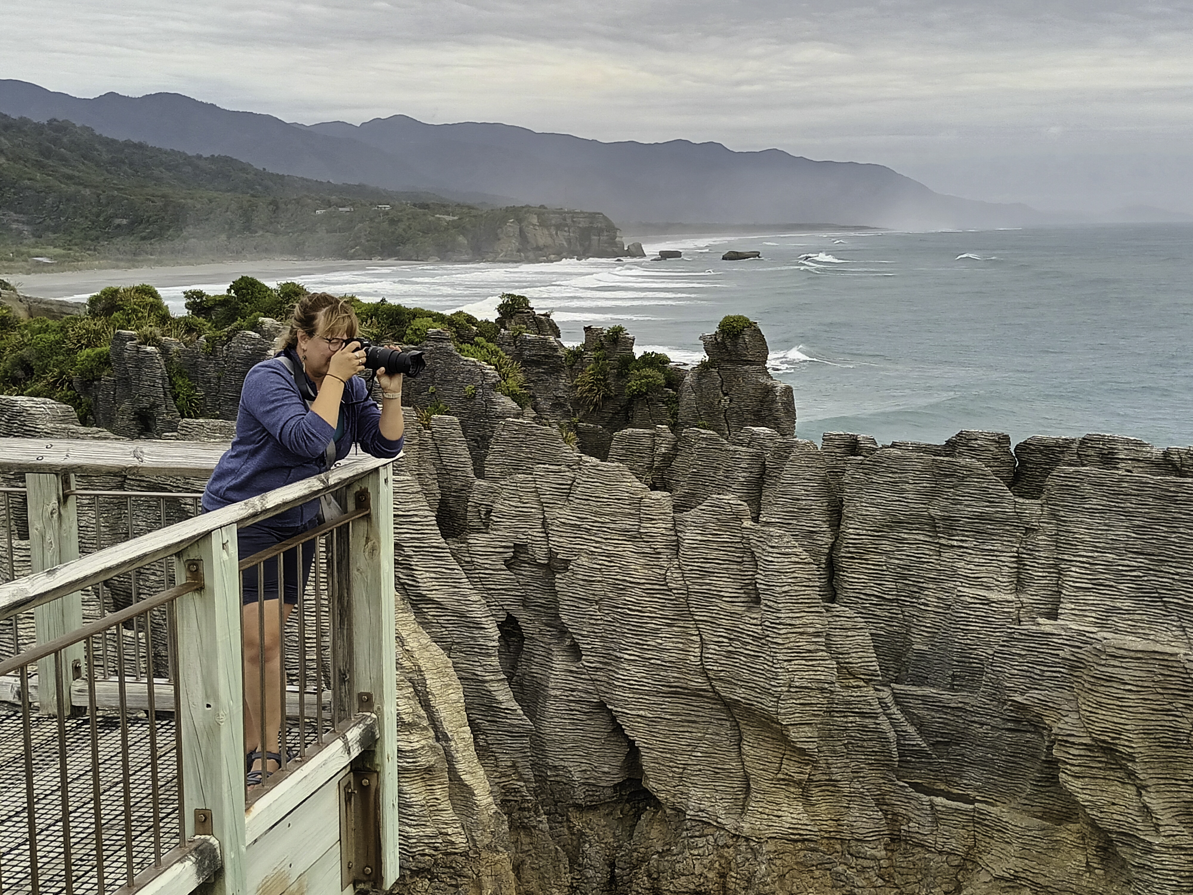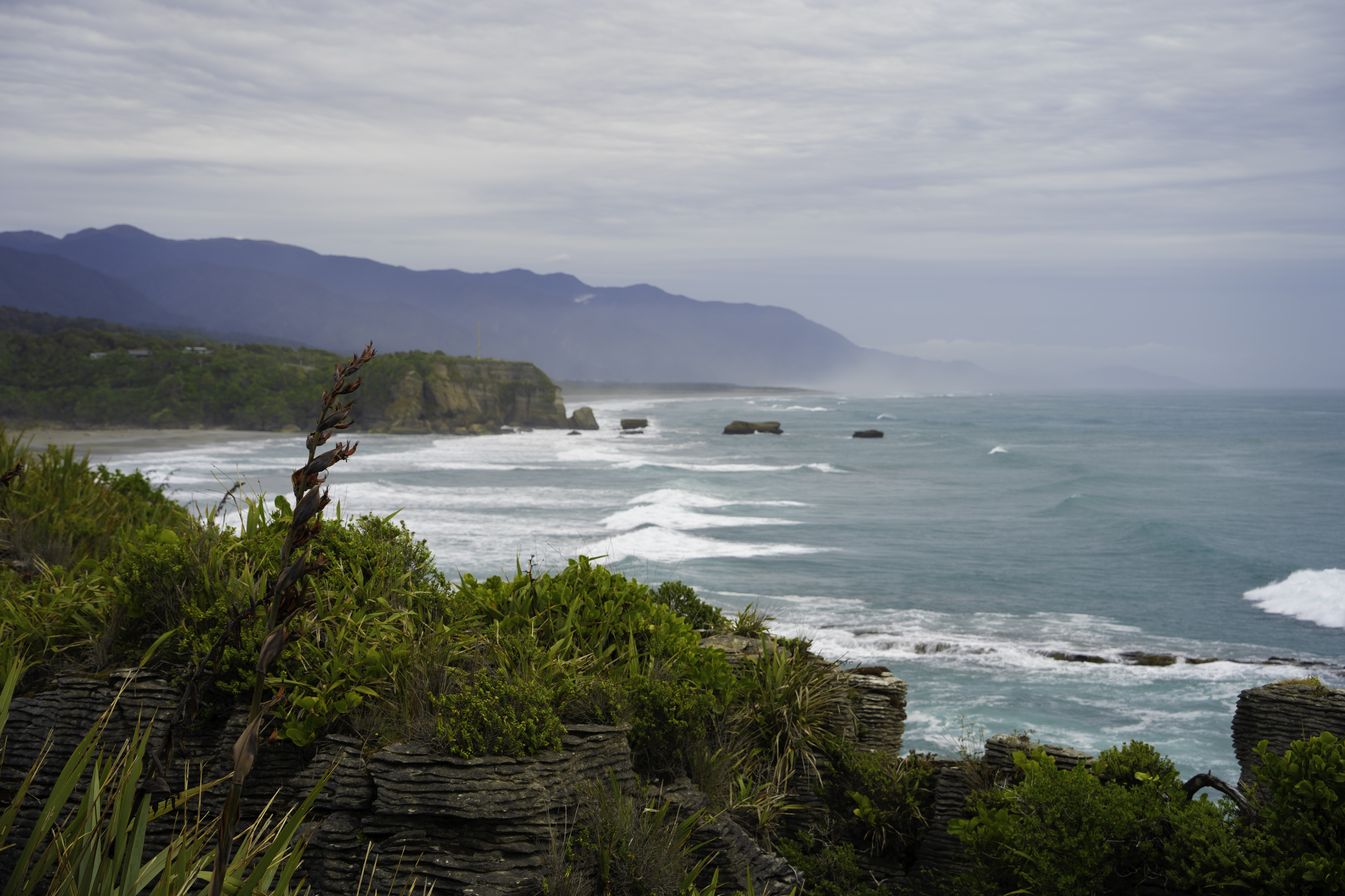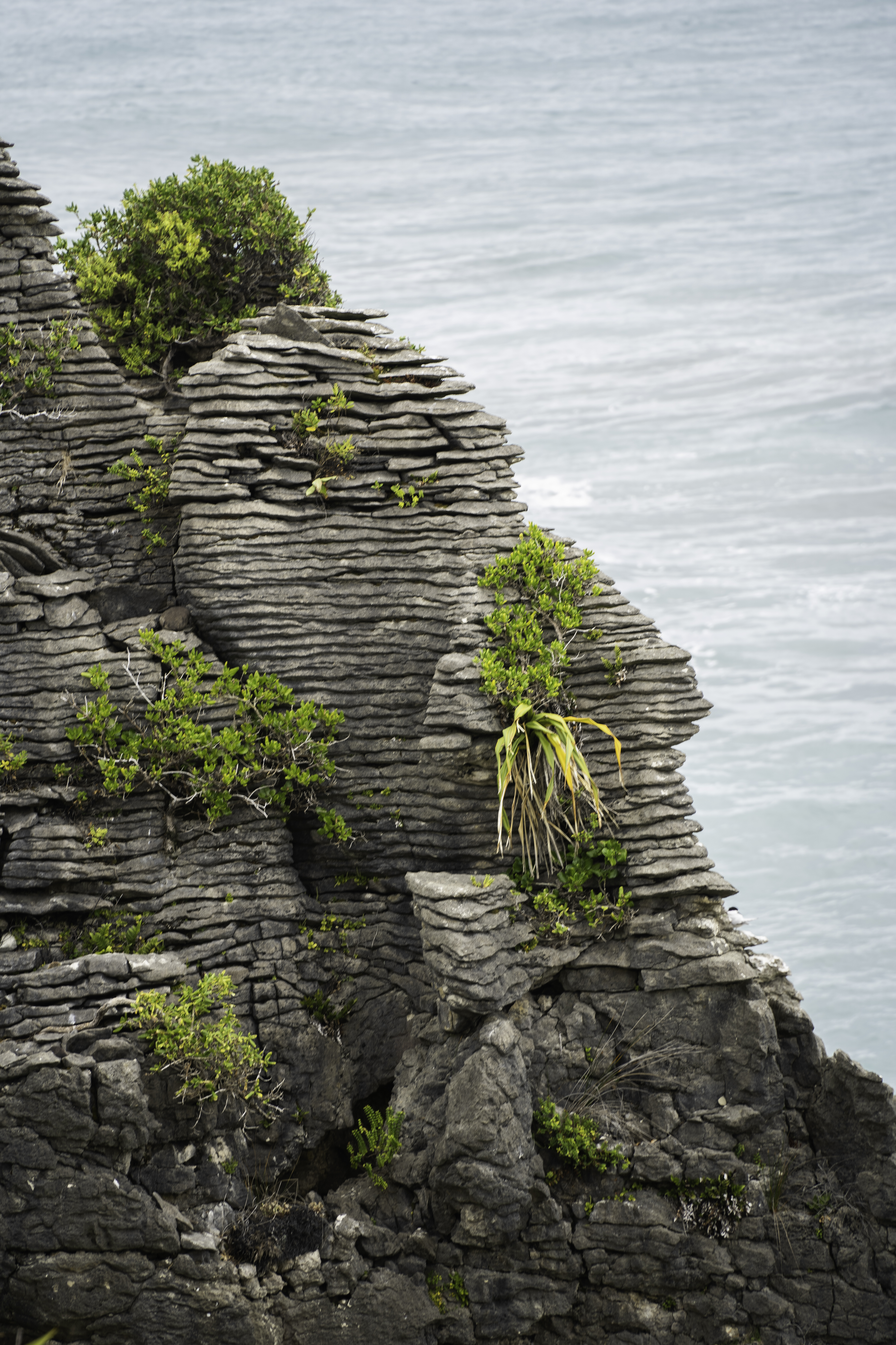 After this lovely day we drove to a new location which I could never pronounce properly: Punakaiki (POO-nah-KIY-kee). This was also a favourite of mine. This tiny little seaside village has fewer than 100 permanent residents. Our Airbnb host said it was just he and his wife and one neighbour on their street. The plethora of information from him in the 20-minute conversation we had attested to this fact. We settled in for a bit and then went out to see the main attraction: the Pancake Rocks and blowholes. This is a section of coastline which is made up of a natural phenomenon of layers of rock that look like stacked pancakes. These layers occur when fossils are deposited on the seabed and covered in weaker layers of mud. Pressure is put on these layers and over 30 million years later, we see the pancake rocks. I loved the landscape and couldn’t stop snapping my shutter. We also spotted a New Zealand pigeon (Kererū), a giant and beautiful bird, and white-fronted terns which gathered on the beach in large flocks. We witnessed the adults fishing and bringing their chicks their catch.