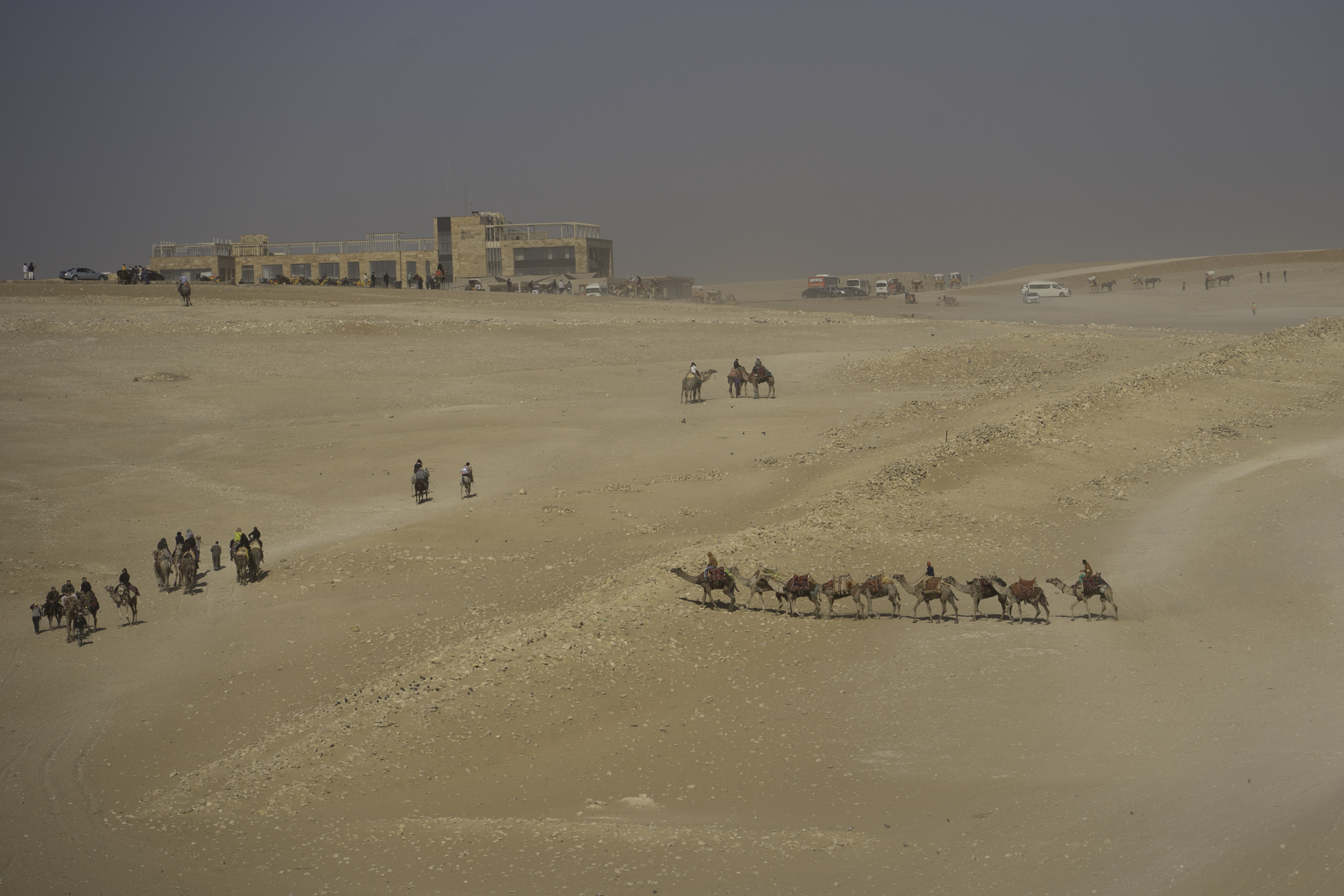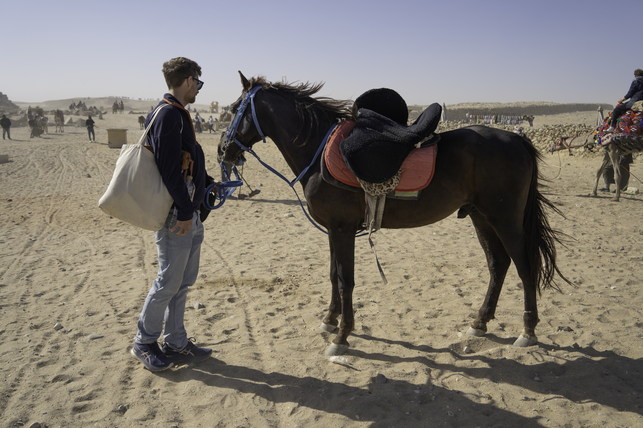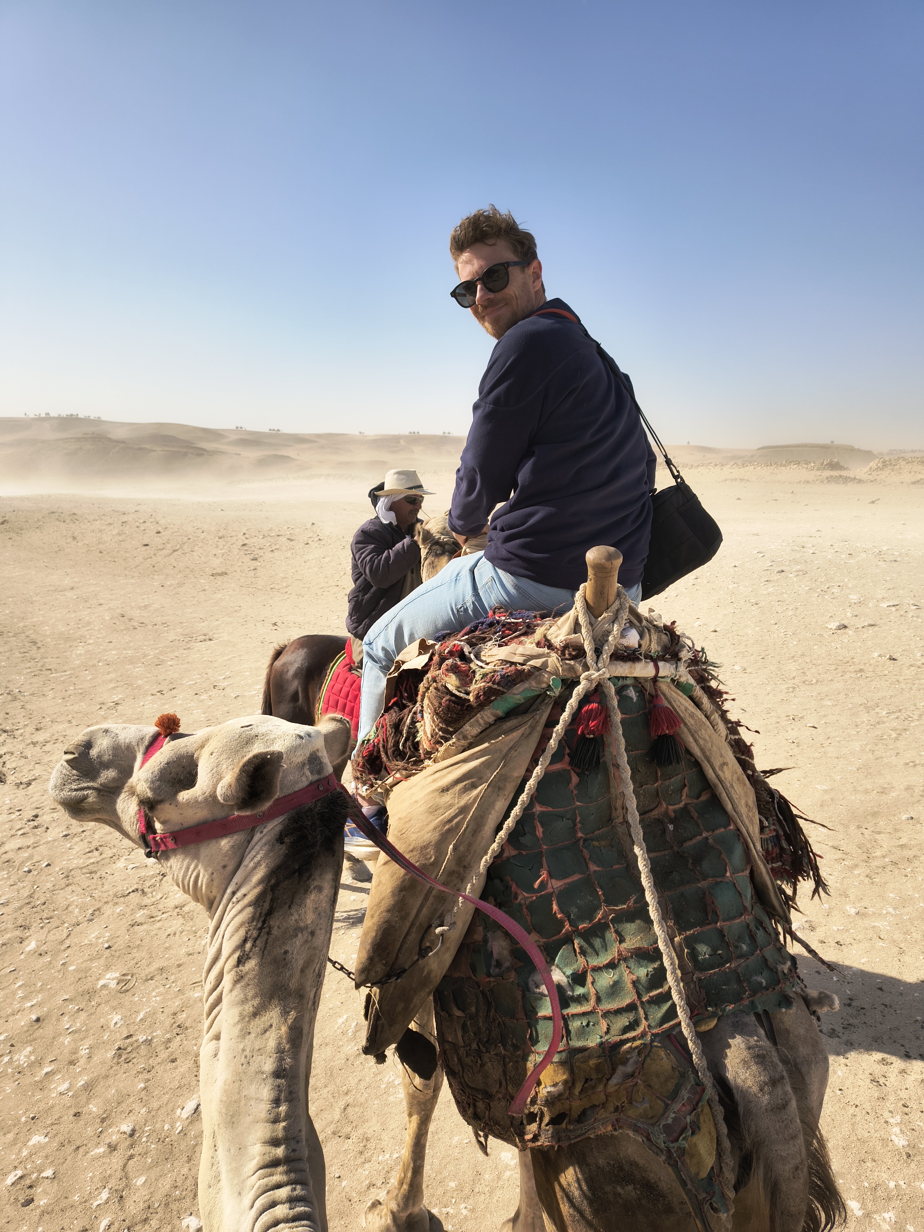 We walked around a bit and I marveled that we were actually there, the pyramids! Wow! There they were! We got approached by a few people selling camel rides and finally I suggested we just do it. We negotiated for a camel ride out to the best viewpoint of the pyramids, about a 10 minute ride away—really not that far. We paid 700EGP and gave a 100 tip, so about $25 AUD for both of us. This ride was hampered by the fact I dropped my lens cap, which I spotted from atop my camel and retrieved by our camel wrangler. Then, a few minutes later, I lost it again and we searched for it everywhere. The guy even went on his horse to backtrack our route, asking others if they had seen it. To no avail. I accepted its loss. I tried to enjoy the ride, but my camera was bouncing around heavily against my chest, my scarf wasn’t behaving, my kerchief wasn’t covering my nose adequately, and my camel started to trot at an alarming pace to catch up with Callum’s. The wind whipped my hair into my face and I couldn’t remove it as my hands were firmly on either saddle handle (one in front, one behind) so as not to fall off. It wasn’t that glamorous and it wasn’t that fun. I tried to get a picture or two of Callum with my phone, but that was all I could manage. I did find my lens cap though! It was stuck under my leg in a way that I couldn’t see at first.