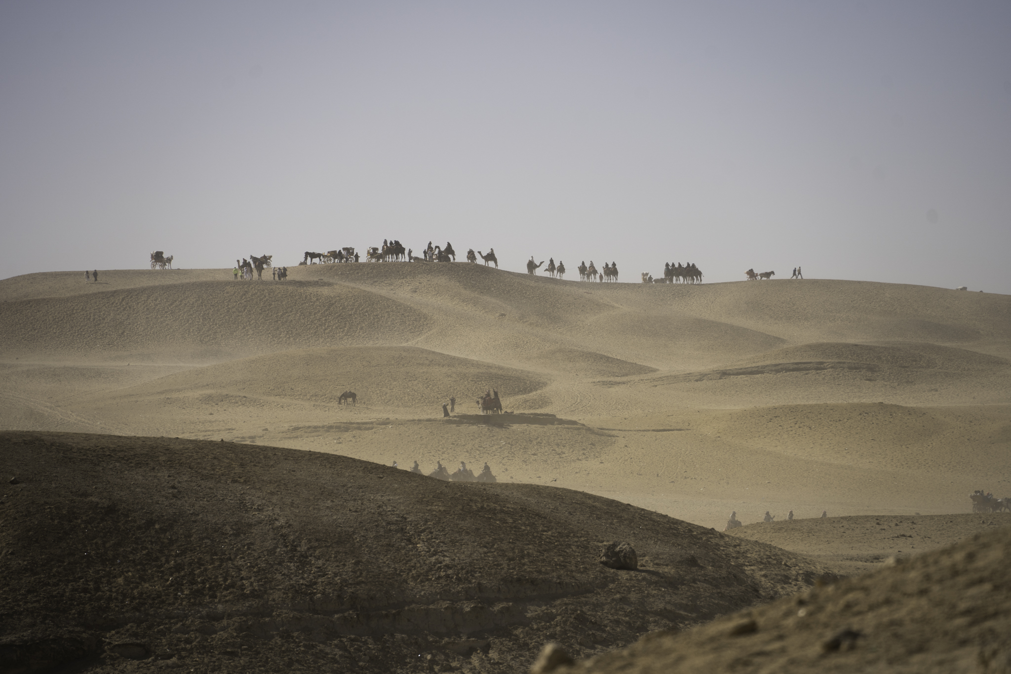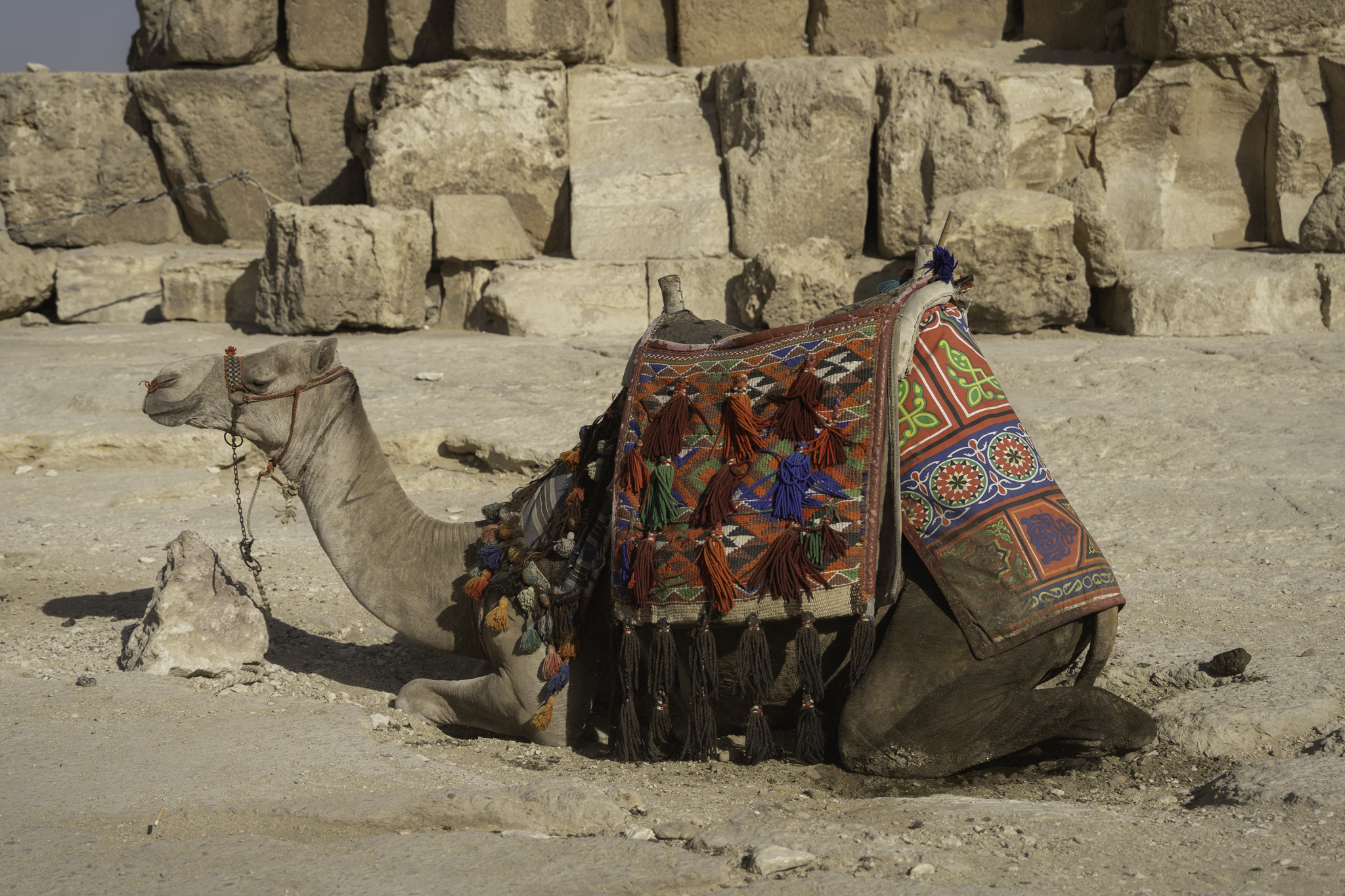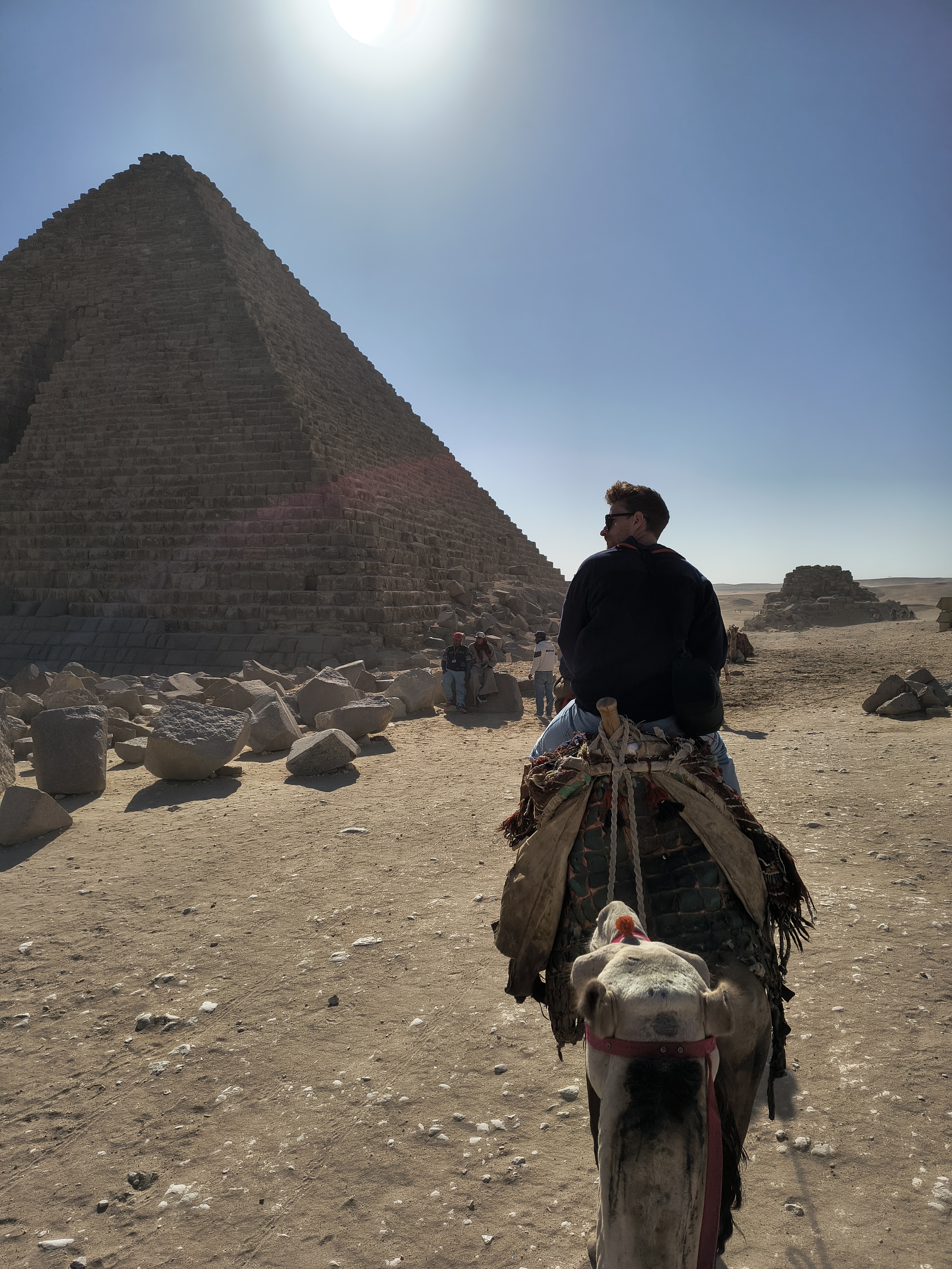 We walked around a bit and I marveled that we were actually there, the pyramids! Wow! There they were! We got approached by a few people selling camel rides and finally I suggested we just do it. We negotiated for a camel ride out to the best viewpoint of the pyramids, about a 10 minute ride away—really not that far. We paid 700EGP and gave a 100 tip, so about $25 AUD for both of us. This ride was hampered by the fact I dropped my lens cap, which I spotted from atop my camel and retrieved by our camel wrangler. Then, a few minutes later, I lost it again and we searched for it everywhere. The guy even went on his horse to backtrack our route, asking others if they had seen it. To no avail. I accepted its loss. I tried to enjoy the ride, but my camera was bouncing around heavily against my chest, my scarf wasn’t behaving, my kerchief wasn’t covering my nose adequately, and my camel started to trot at an alarming pace to catch up with Callum’s. The wind whipped my hair into my face and I couldn’t remove it as my hands were firmly on either saddle handle (one in front, one behind) so as not to fall off. It wasn’t that glamorous and it wasn’t that fun. I tried to get a picture or two of Callum with my phone, but that was all I could manage. I did find my lens cap though! It was stuck under my leg in a way that I couldn’t see at first.