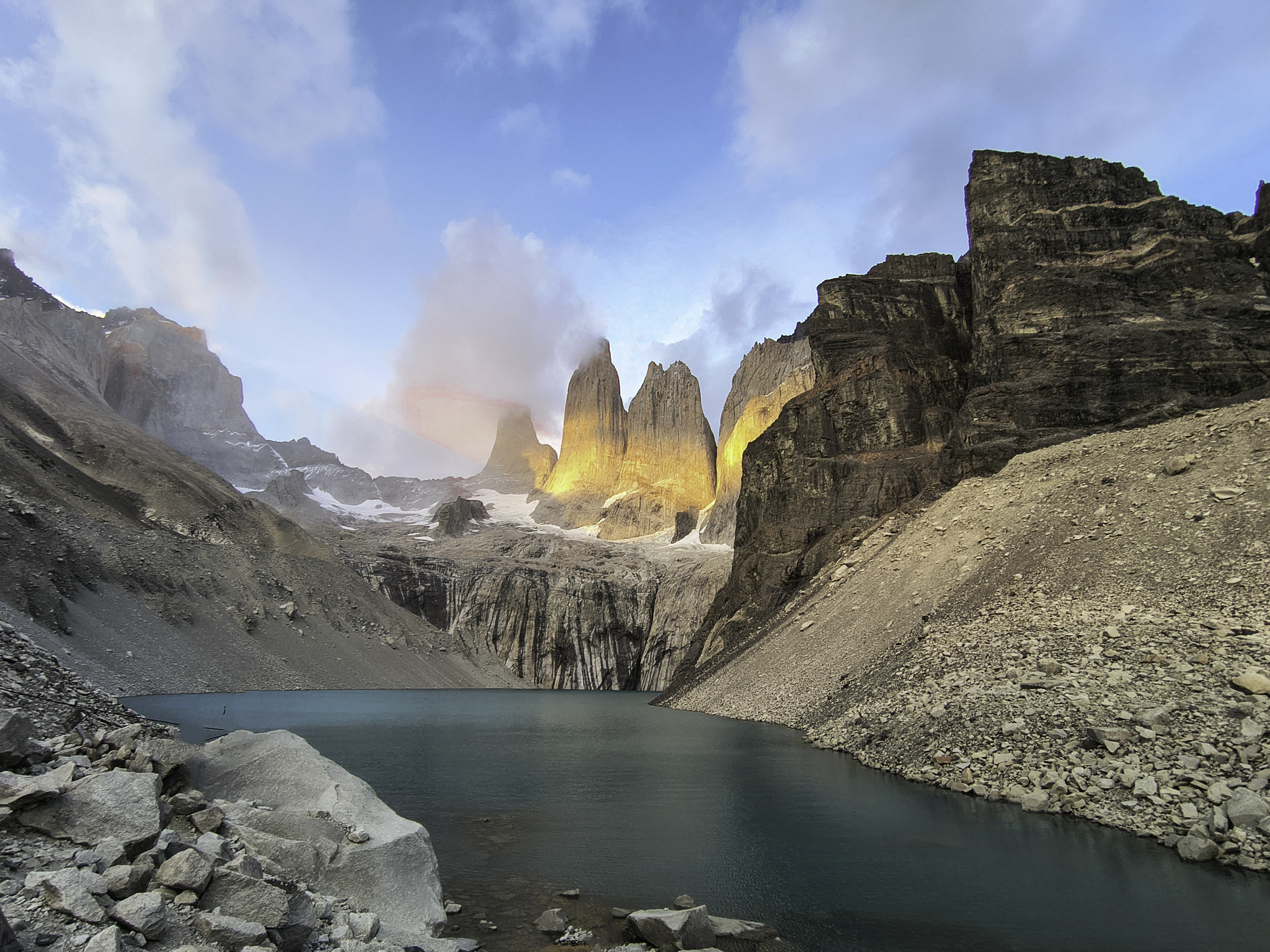 The final day was a rude wake up at 4am to disassemble our campsite, leave our bags, and hike up to the torres. Unfortunately, about 2/3 of the way up we followed a path of headlamps that led us off-trail and up the side of the mountain on the sketchiest scree scramble I’ve ever seen. I 100% would not recommend that almost deadly detour. Next time, stop, reassess, figure out earlier that there aren’t any trail markers, people ahead of you have gone the wrong way, backtrack, be safe. Anyway. We made it to the top just in time for sunrise, it was beautiful, but a little hard to enjoy it initially after our traumatic detour. Once we calmed down it was absolutely worth the struggle, and a memory I’ll never forget. After countless photos at the top, we hiked down, grabbed our bags and made the 2-hour hike back down to the bottom, spent heaps of money at the cafeteria gift shop, caught two buses, and made it back to Puerto Natales in time for dinner.