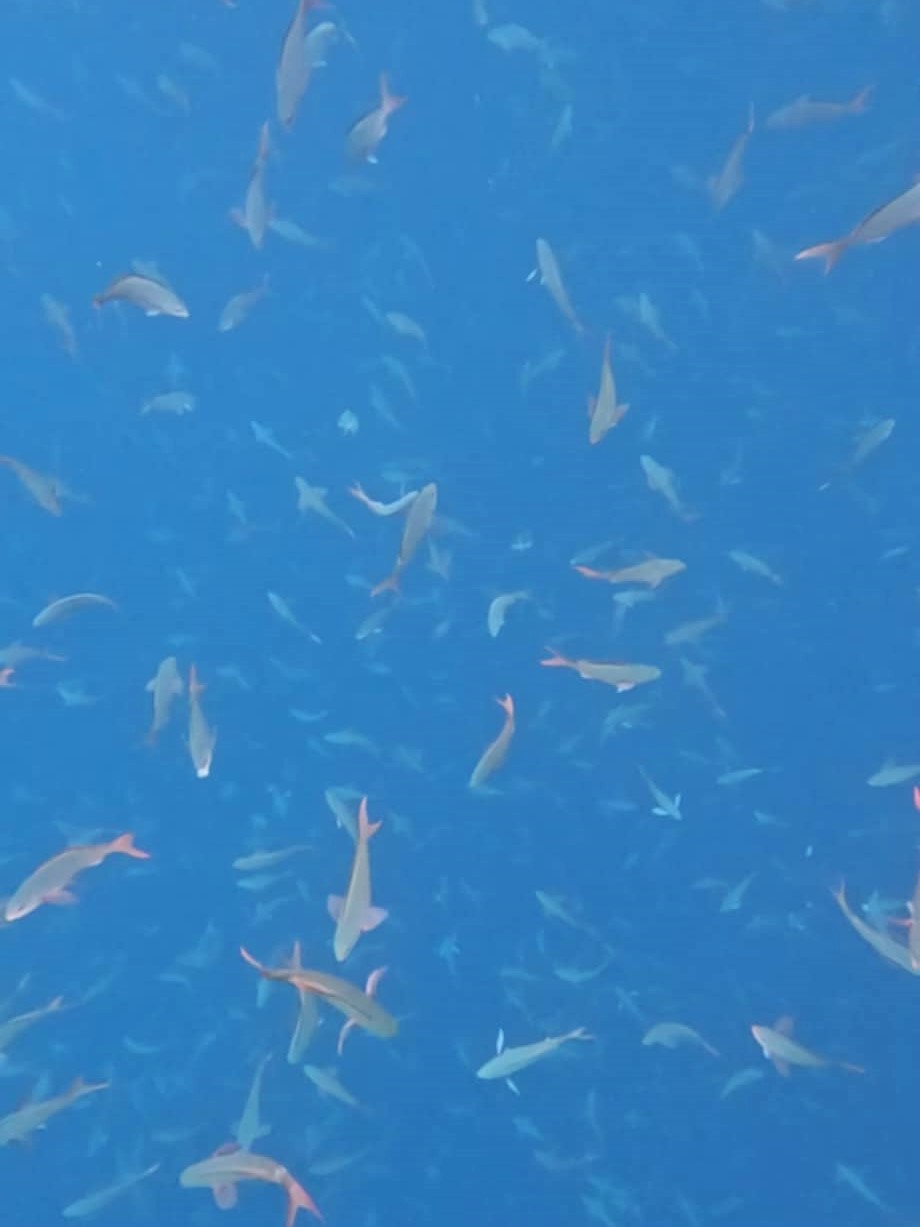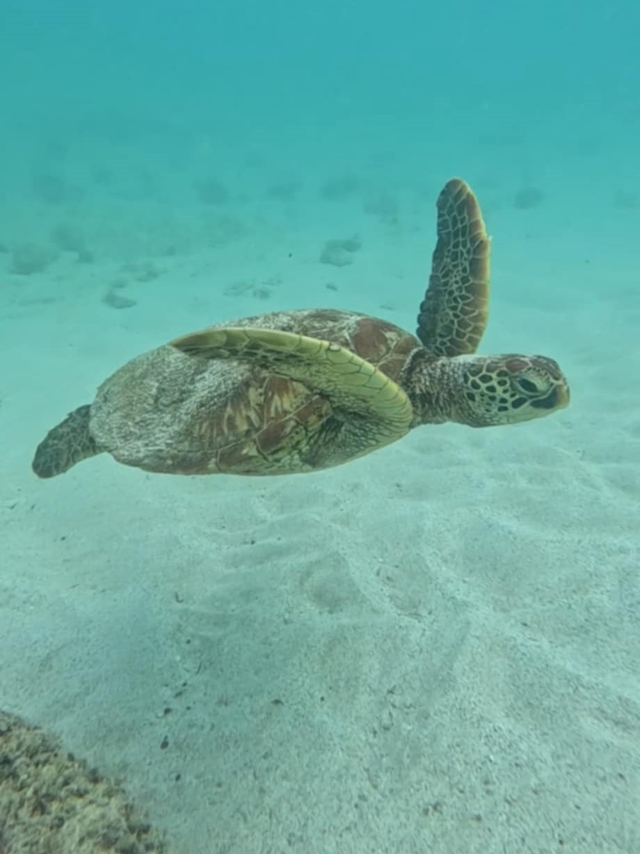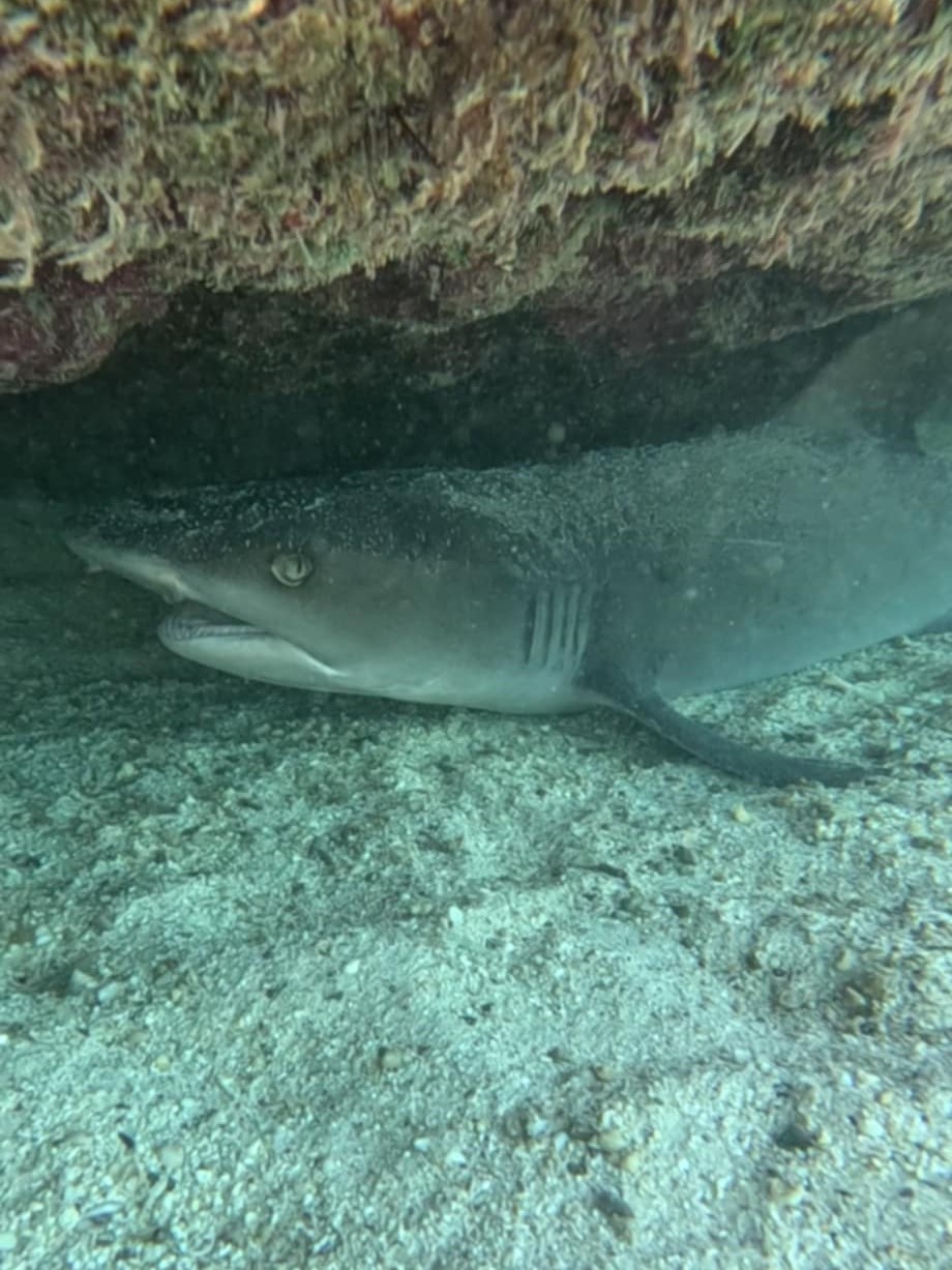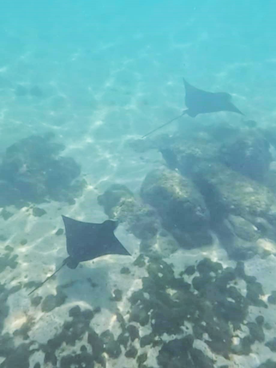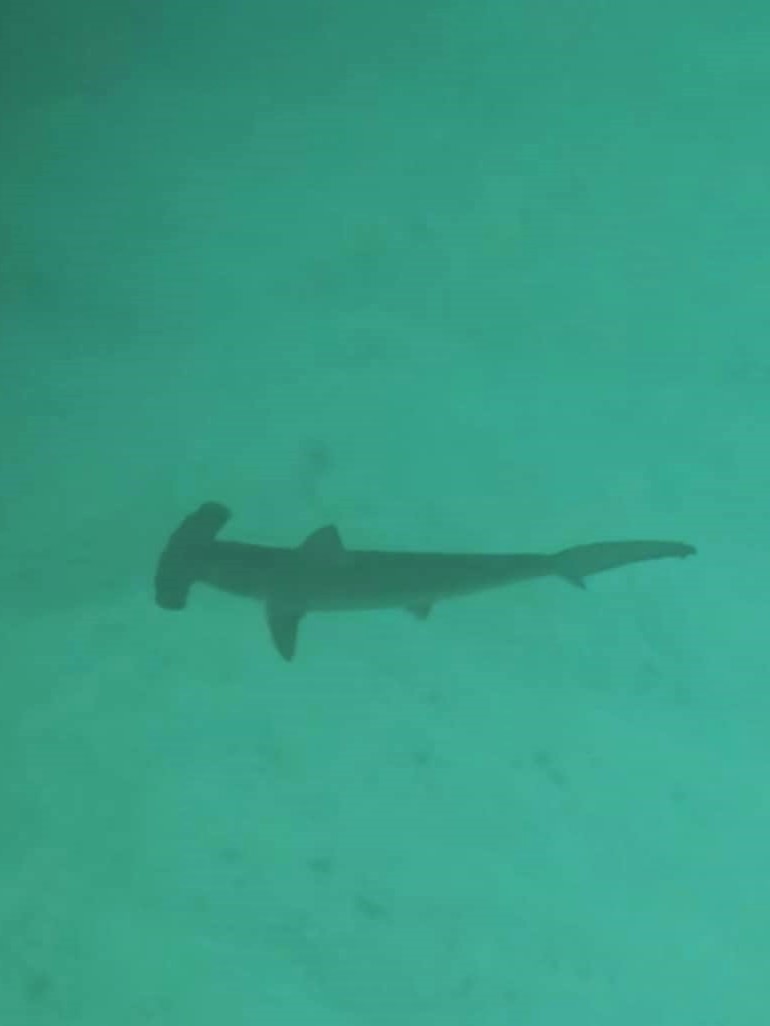 At one point we swam in between the two rocks where it was shallower, and the bottom was sandy. It was here I was able to see four for five hammerheads more clearly from the surface. I was mesmerised. I thought they were the coolest thing I’d ever seen with my own eyeballs.