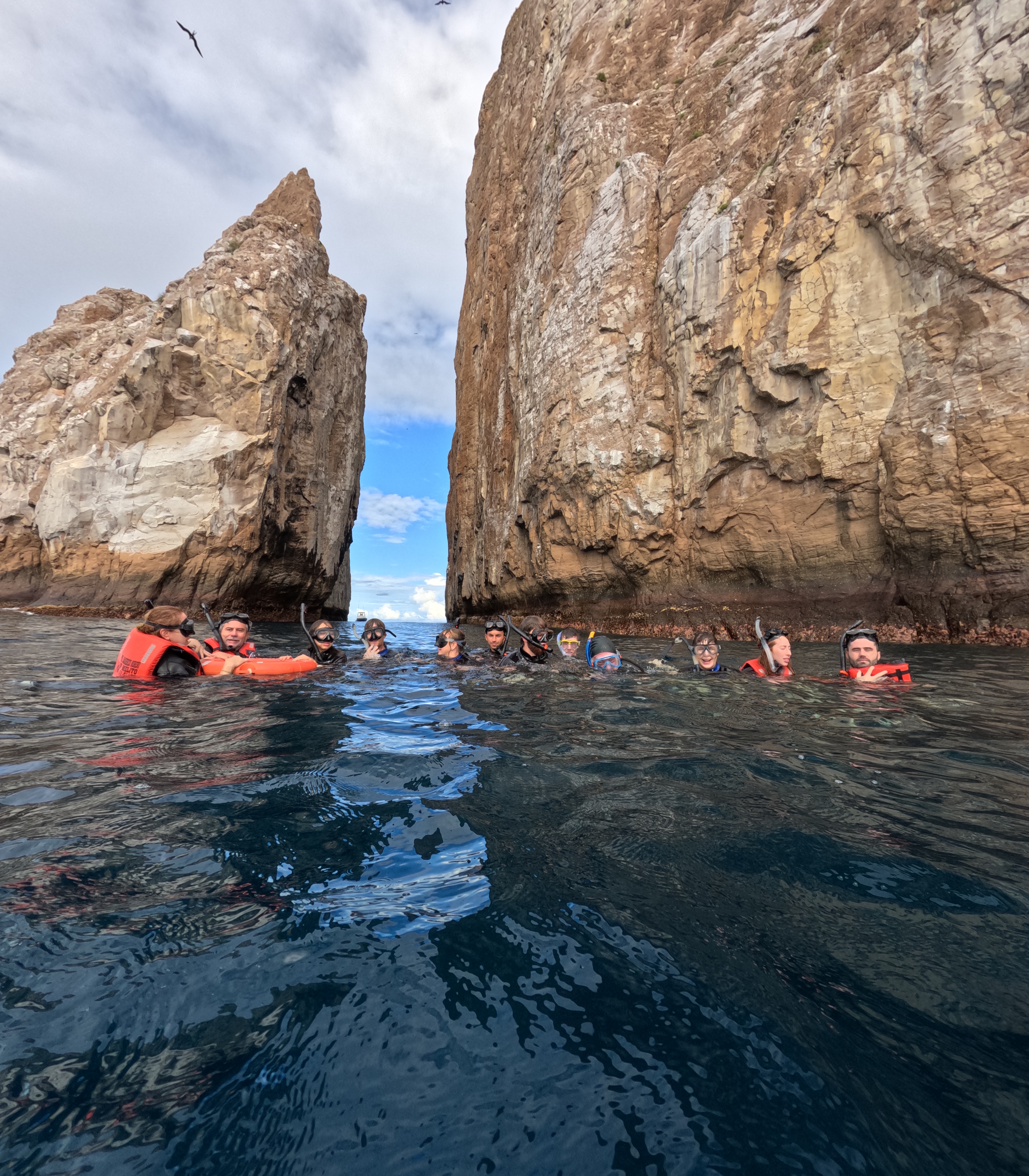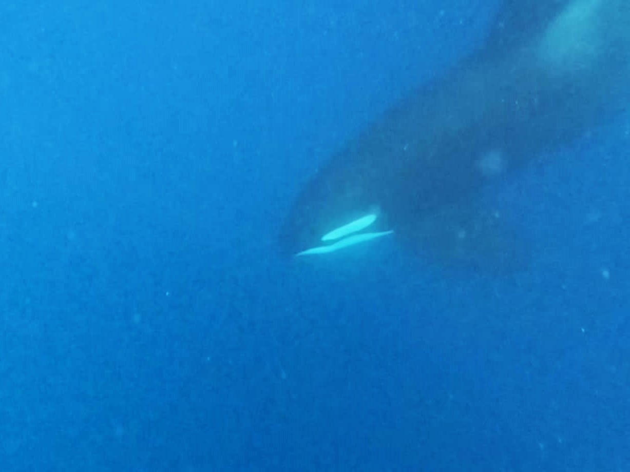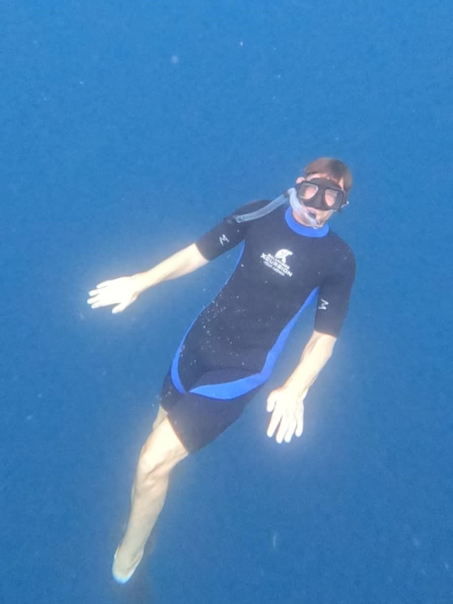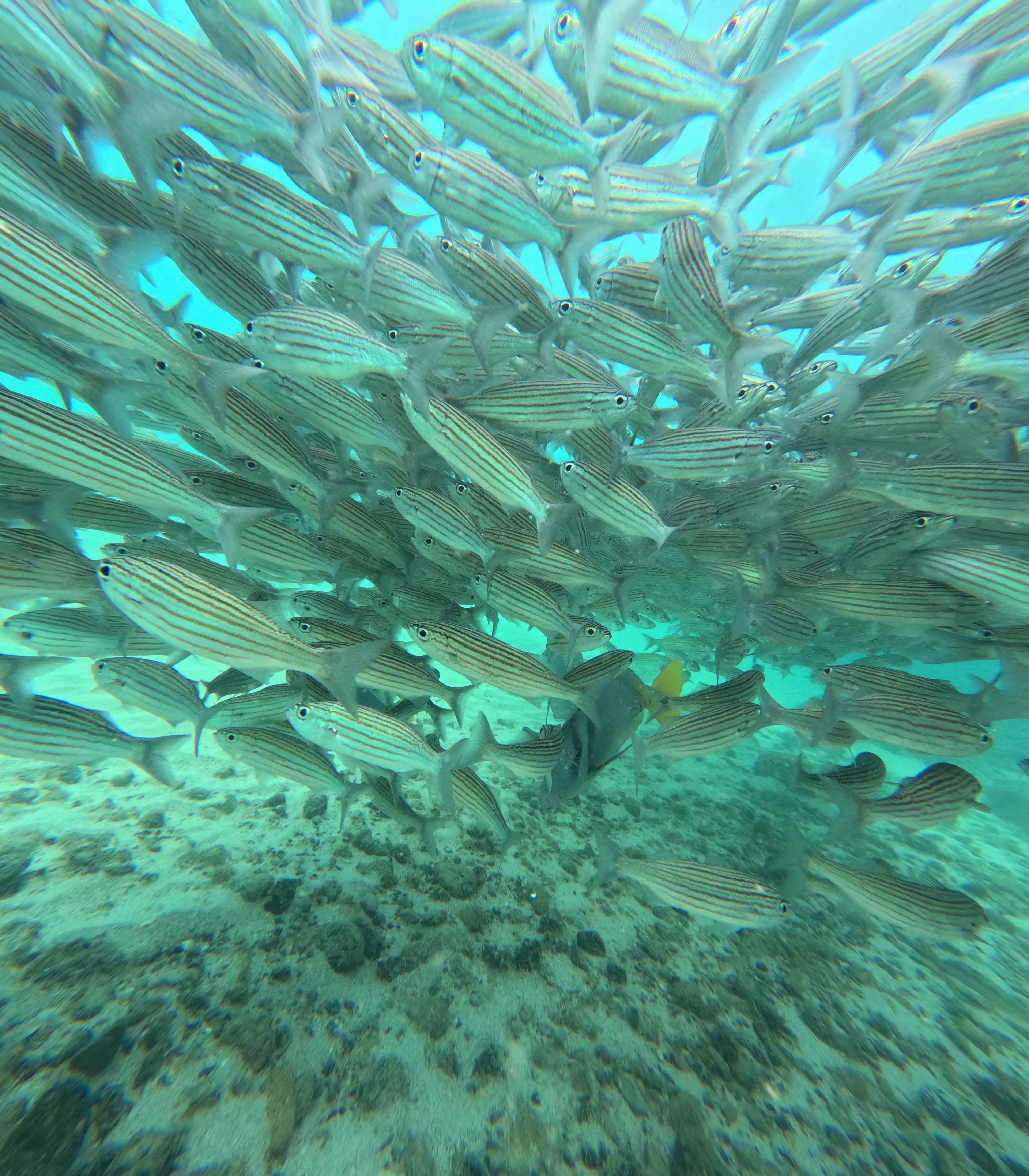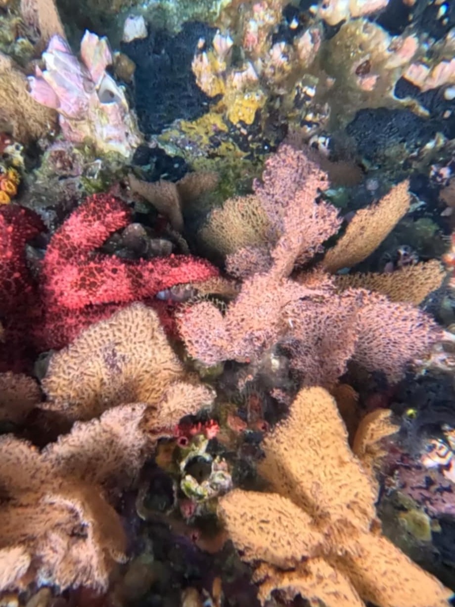 At one point we swam in between the two rocks where it was shallower, and the bottom was sandy. It was here I was able to see four for five hammerheads more clearly from the surface. I was mesmerised. I thought they were the coolest thing I’d ever seen with my own eyeballs.