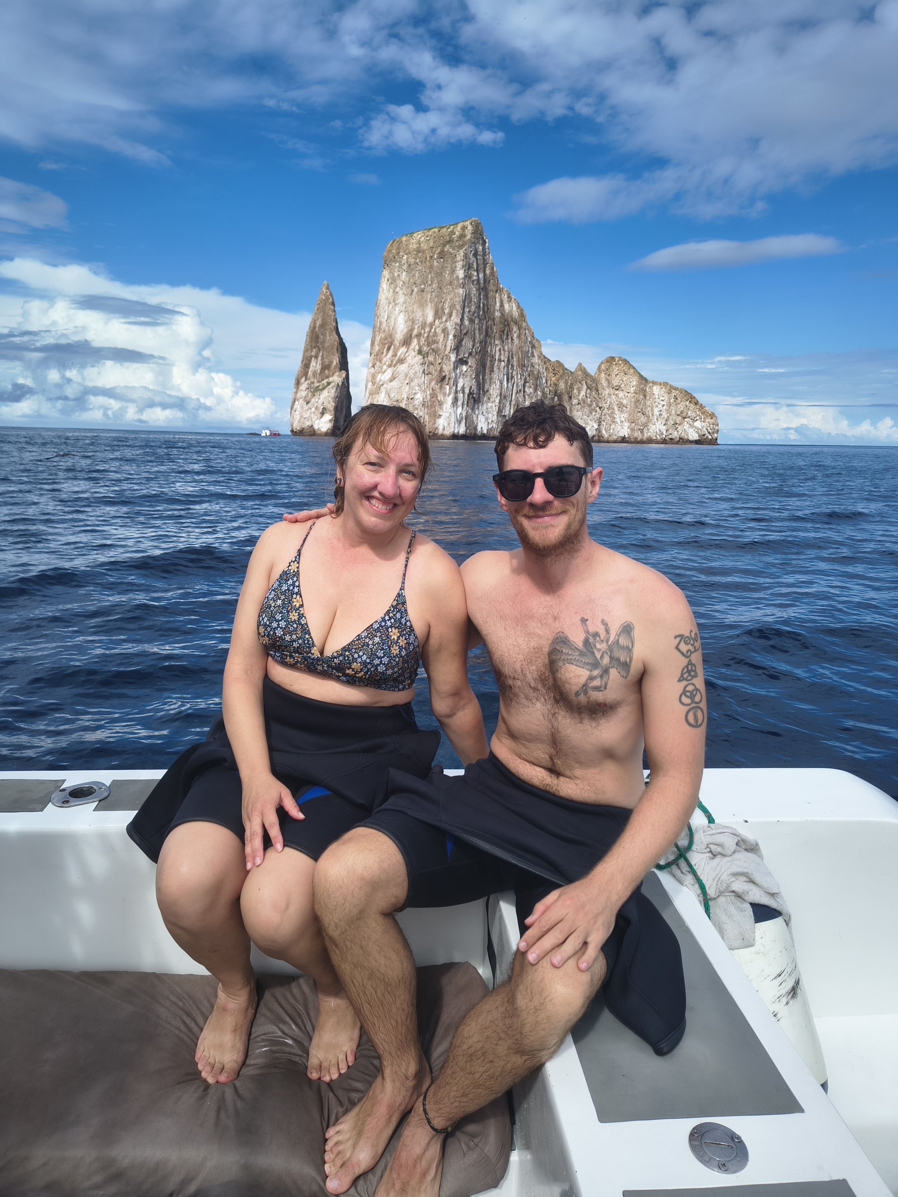 Finally, we enjoyed the 360 tour where after being fitted with wetsuits at the tour office, we were taken out on a boat further into the ocean with our first stop being ‘Kicker Rock’. This is a pair of giant rocks jutting out of the ocean like a cathedral. It is at this location we jumped into the deep water and dove down a bit to see the hammerheads on the ocean floor, circling and hunting for their food. I was quite nervous during the boat ride out, as I am not a fan of deep water…or of sharks. Well, everyone else was pumped and positive and the energy rubbed off on me. I jumped in confidently and saw thousands of fish at varying depths below my fins, with the vibrant blue of the water dazzling my eyes. I strained to see sharks, nervously waiting to be spooked by one. The guide gathered us around and encouraged us to stick close. He would dive quite deep then pop up and enthusiastically bellow “Whoa, sharks right below you! Hammerhead sharks! Whoooo!” I learned that if I wanted to see them, I’d have to dive a bit deeper. I learned how to do it and did indeed see the shapes of hammerheads far below, blurry and obscured by the deep currents. It was a bit scary but honestly, I was so interested and impressed with all the other fish we were seeing, that the scary feeling went away.