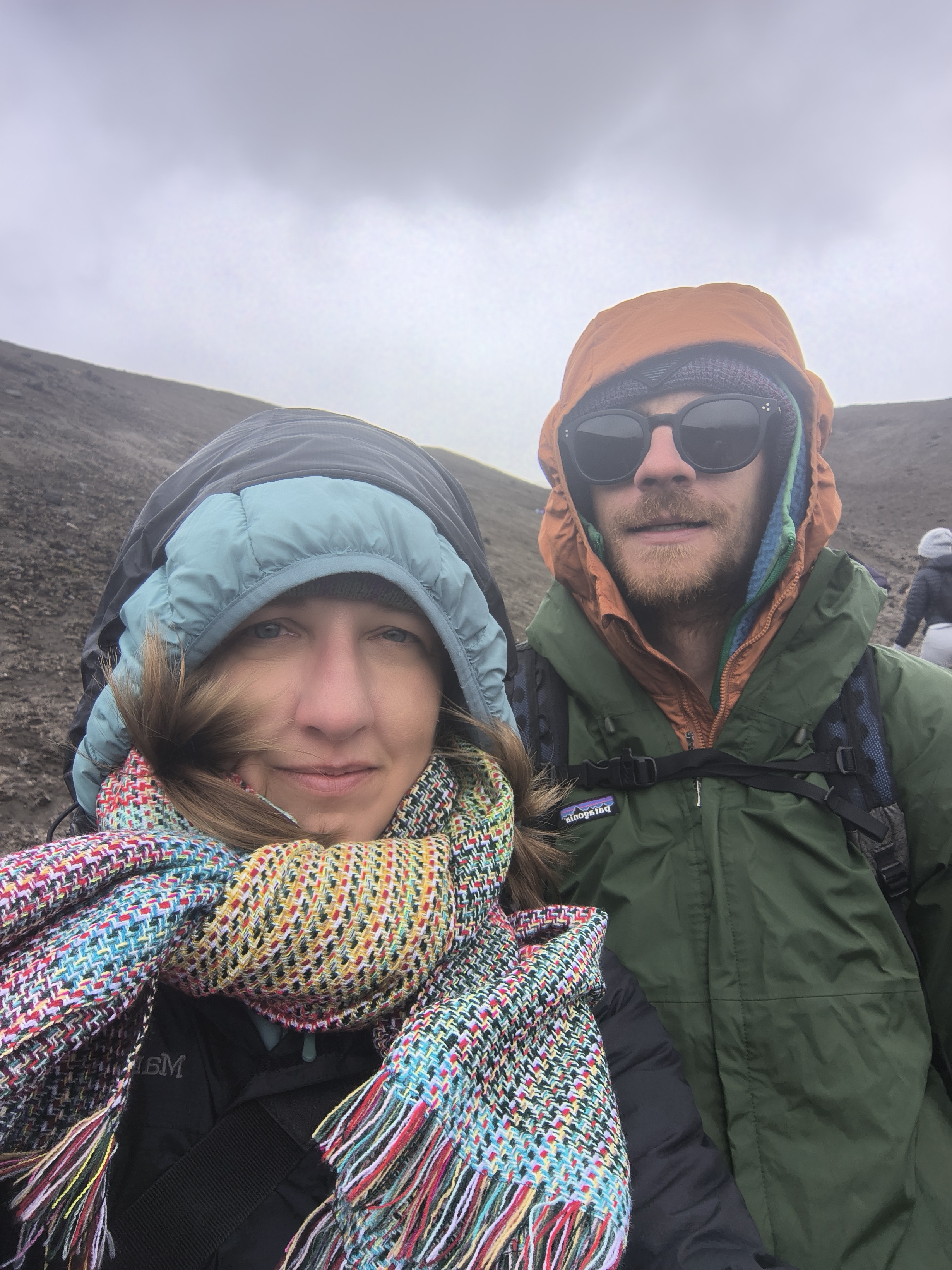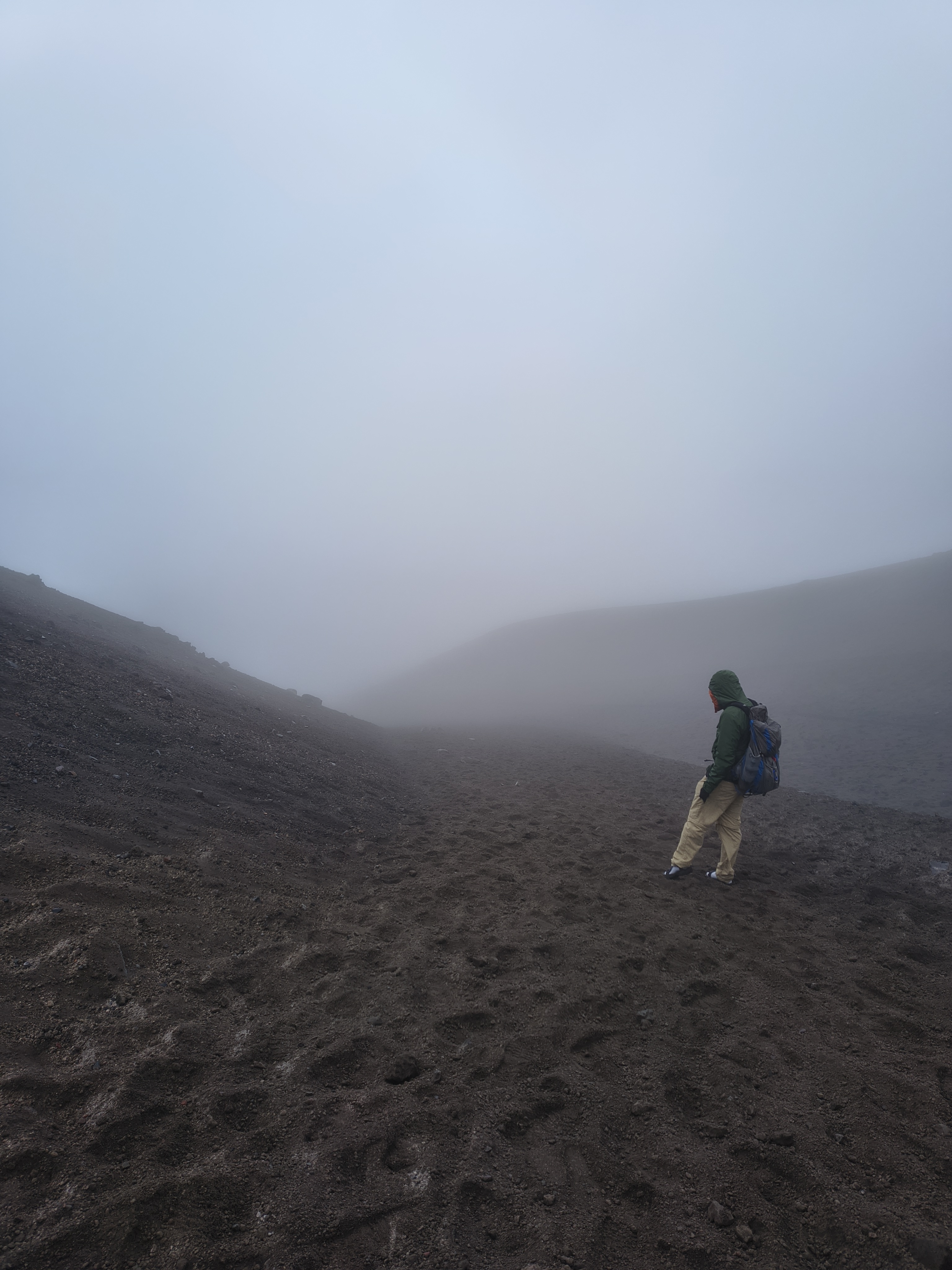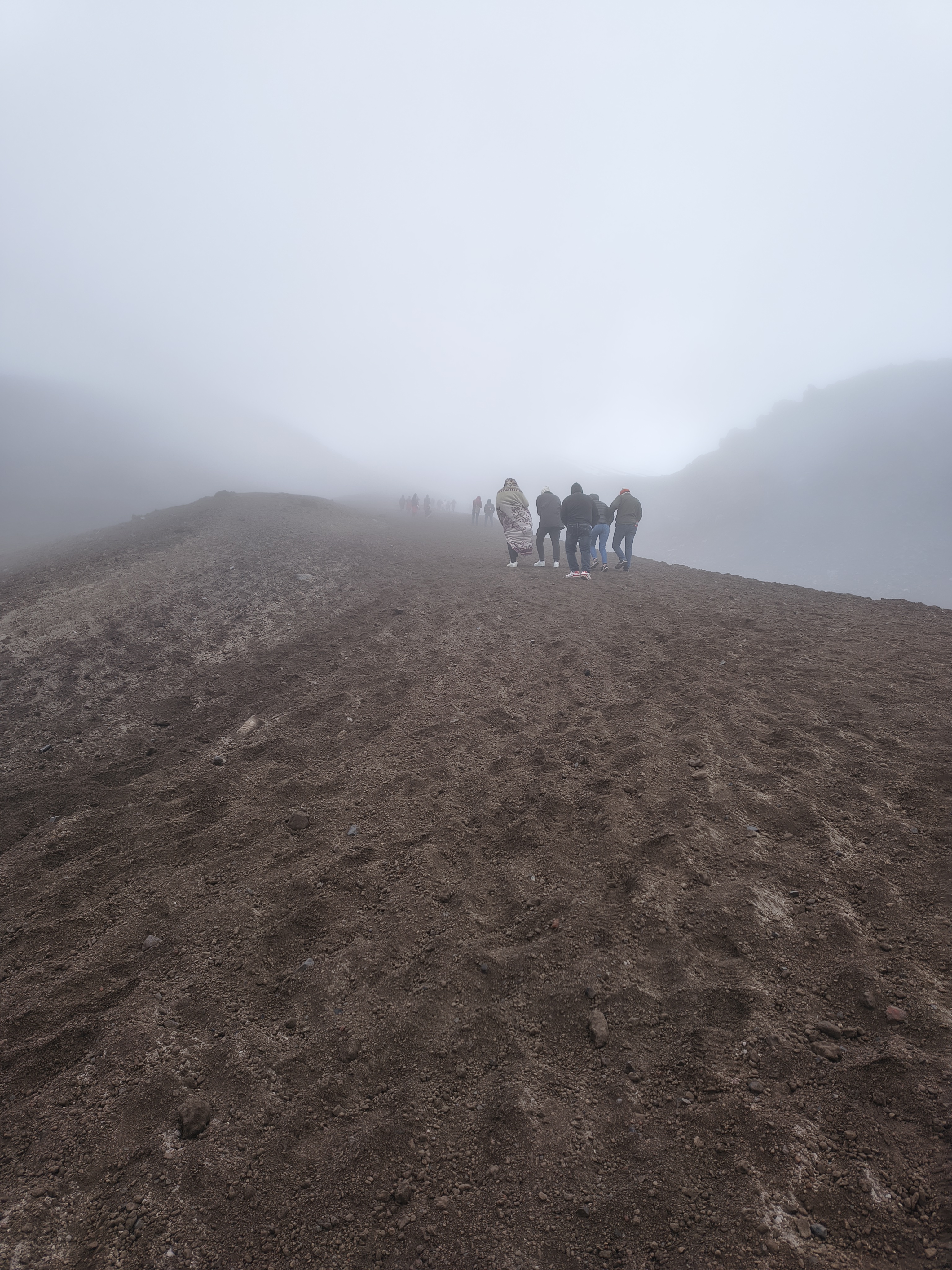 I should mention that there was zero view to speak of the entire walk up, which was the main reason for doing this hike. There was literally nothing to look at besides the white out fog where a volcano was supposed to be. We were both bummed out—why all this time, money, and effort to see nothing? The others in our tour group had a much better attitude. They seemed to be there for the challenge and were happy they had experienced it and made it.