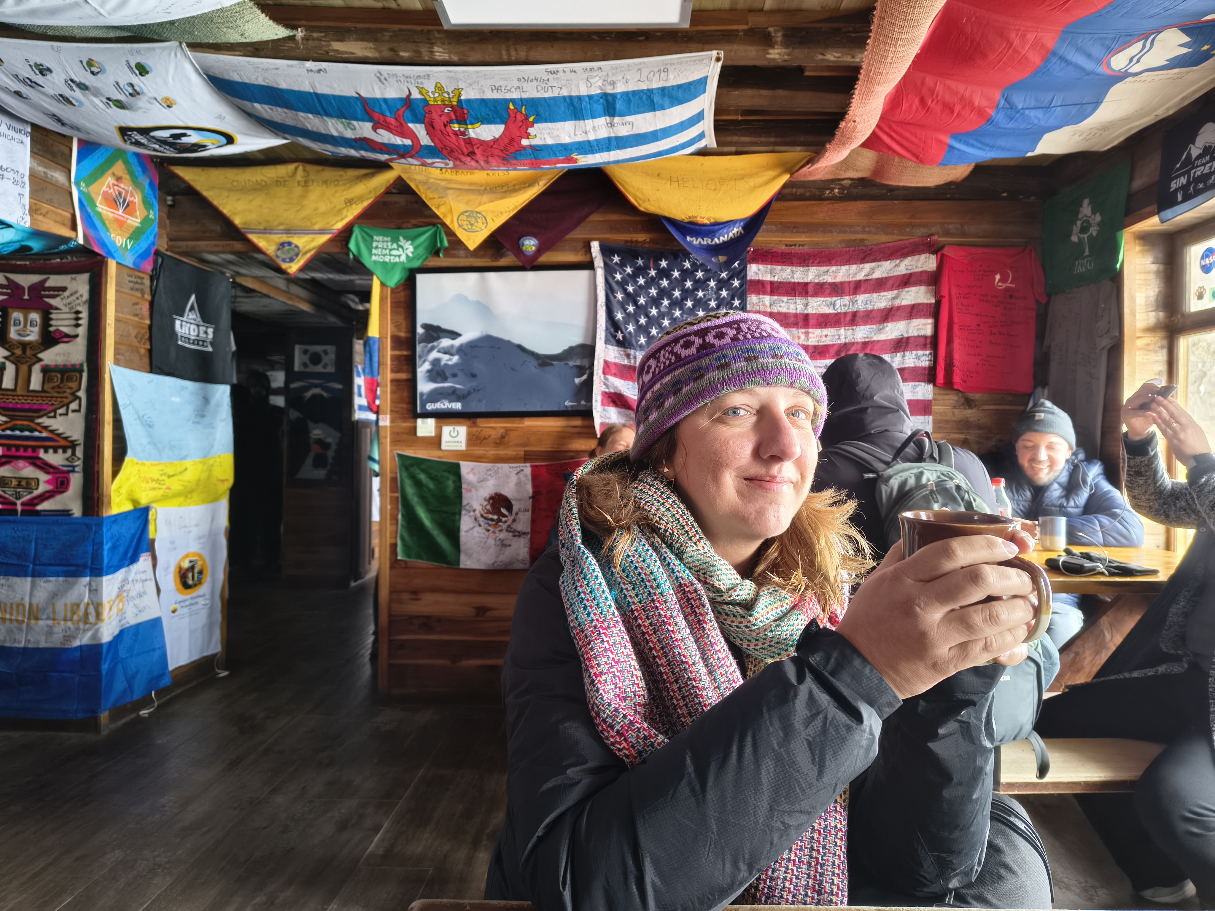 When I was nearly at the top, with all the panting tourists resting on the first steps of the refugio looking down at me, I needed another rest. I was only 30 steps from the top, but I had done my 100 and I needed the break! I finally made it and was congratulated by others and by Callum who had been waiting a long time for me. We went inside the refugio and had a hot chocolate and the peanut M&Ms that I had brought up as well, chatting with others in our group and resting before the descent. It took me exactly one hour to hike up 800 meters. The final elevation at the refugio is 4800 meters, which meant we only gained 200 metres in height, but the 800 metres of distance was some of the hardest hiking I’ve ever done.